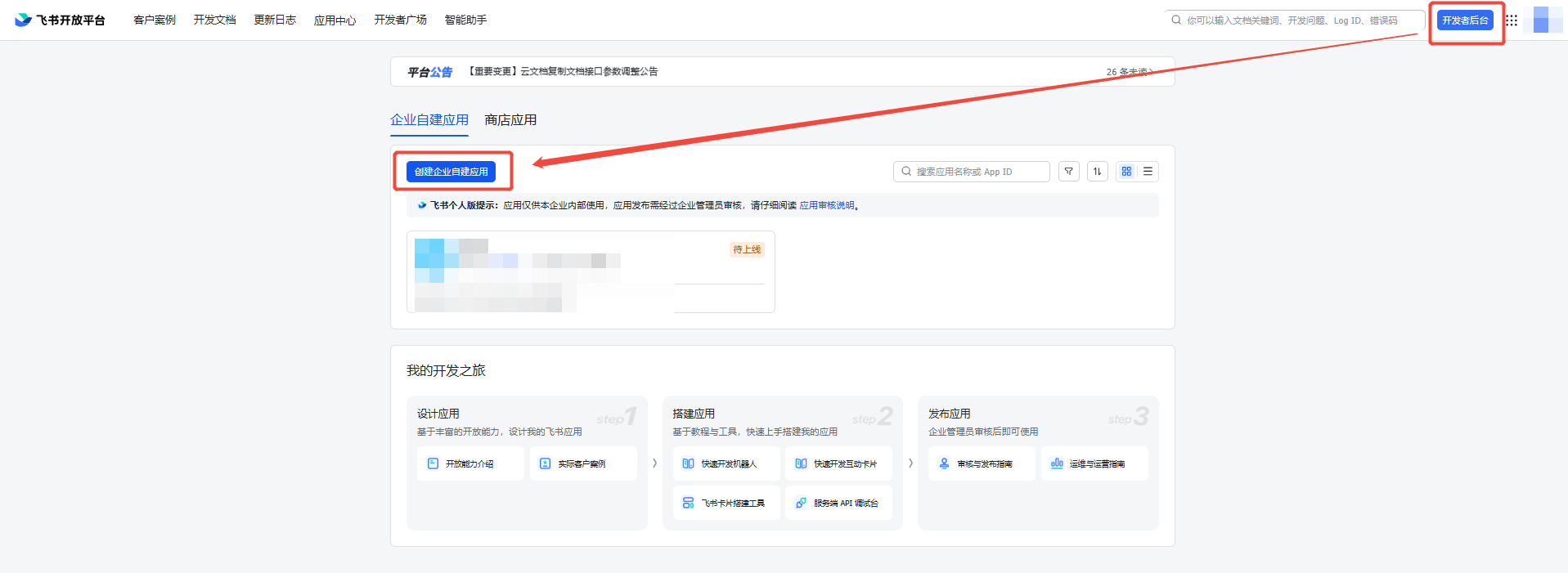请提前开通飞书企业管理员权限,登录飞书开发者后台:https://open.feishu.cn/app 按以下步骤创建及配置飞书企业自建应用。