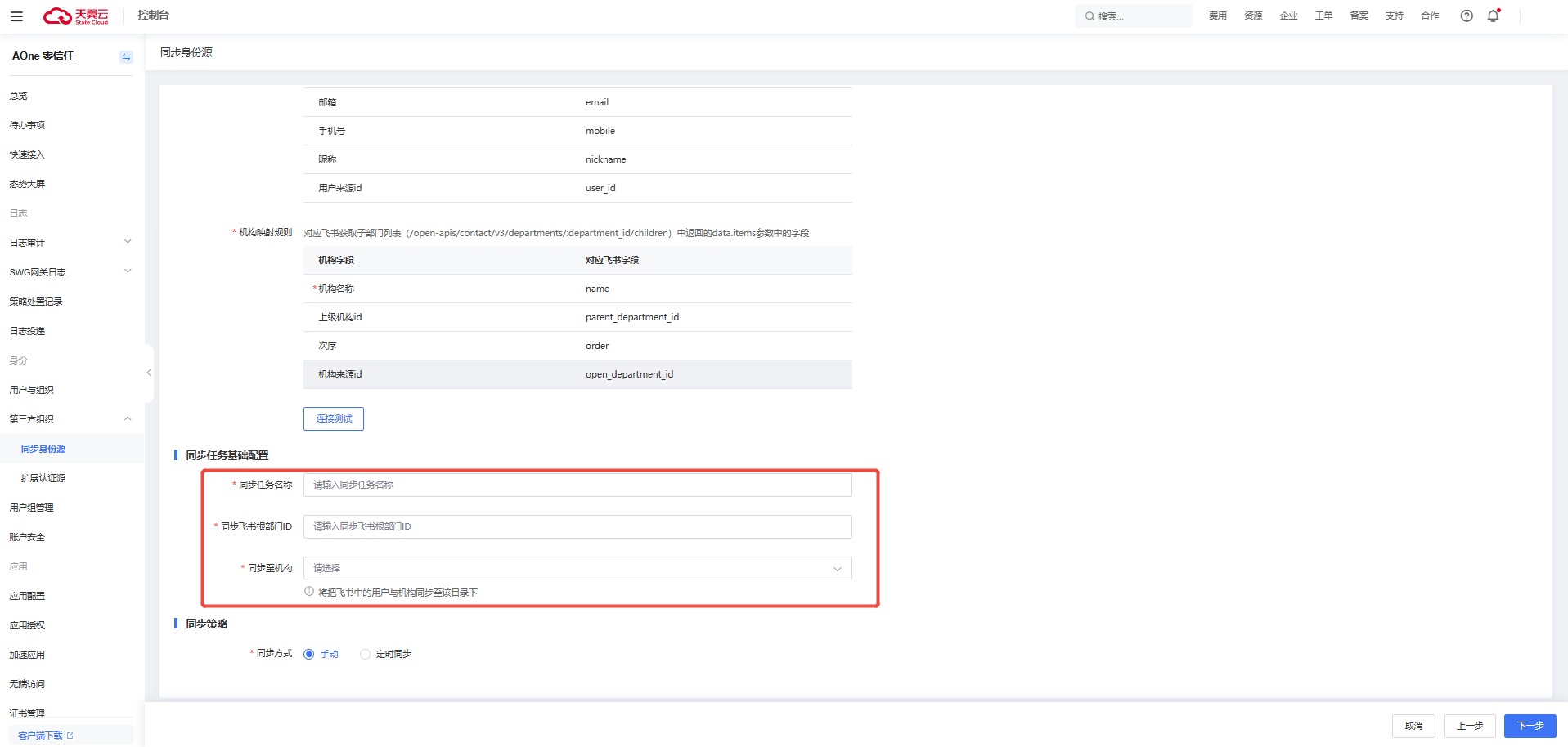 | 2 | 同步飞书根部门ID | 见上方【前置准备】-【准备创建飞书同步身份源配置参数】中的同步飞书根部门ID |