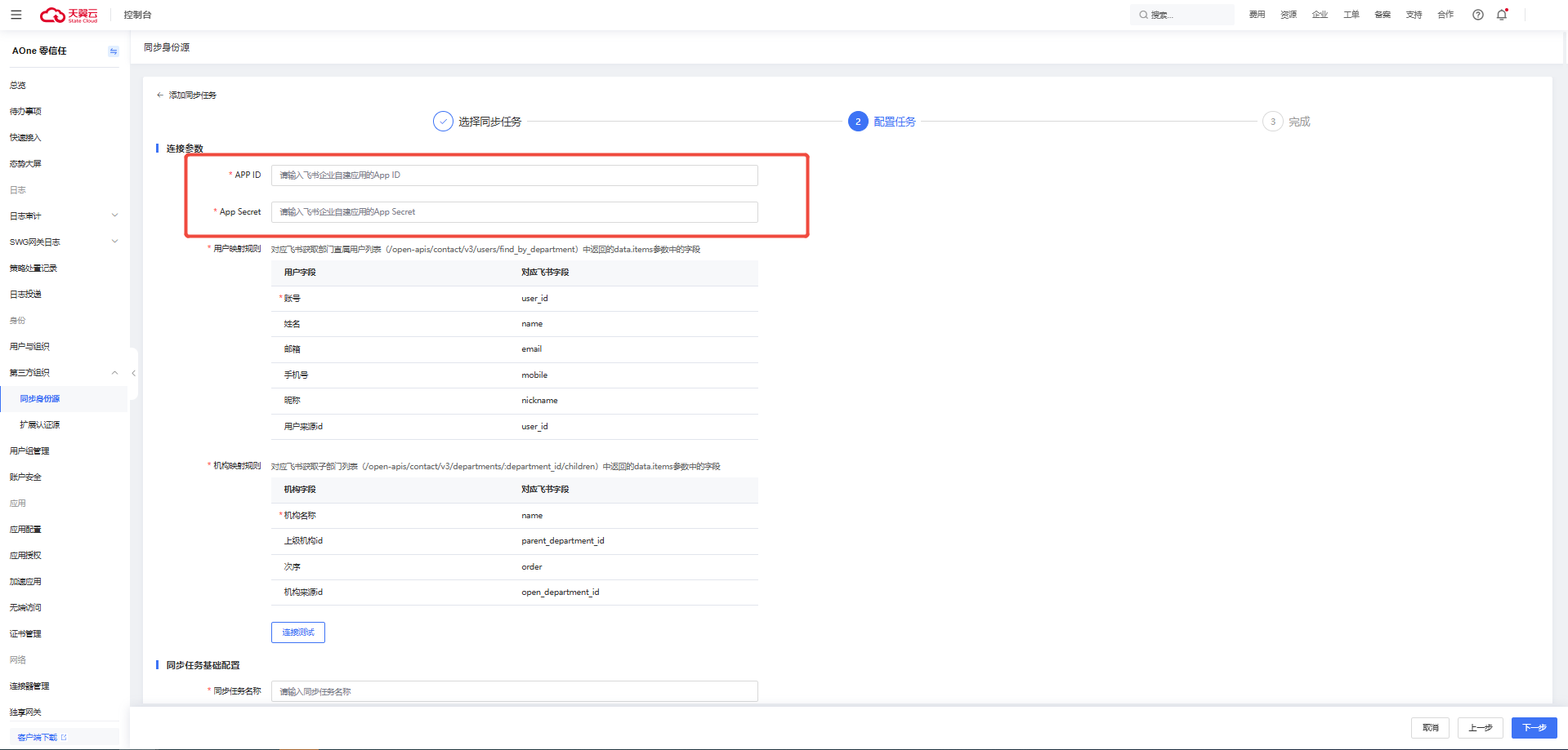 | 1 | 同步任务名称 | 输入限制为16个字符,建议为:飞书身份源 |