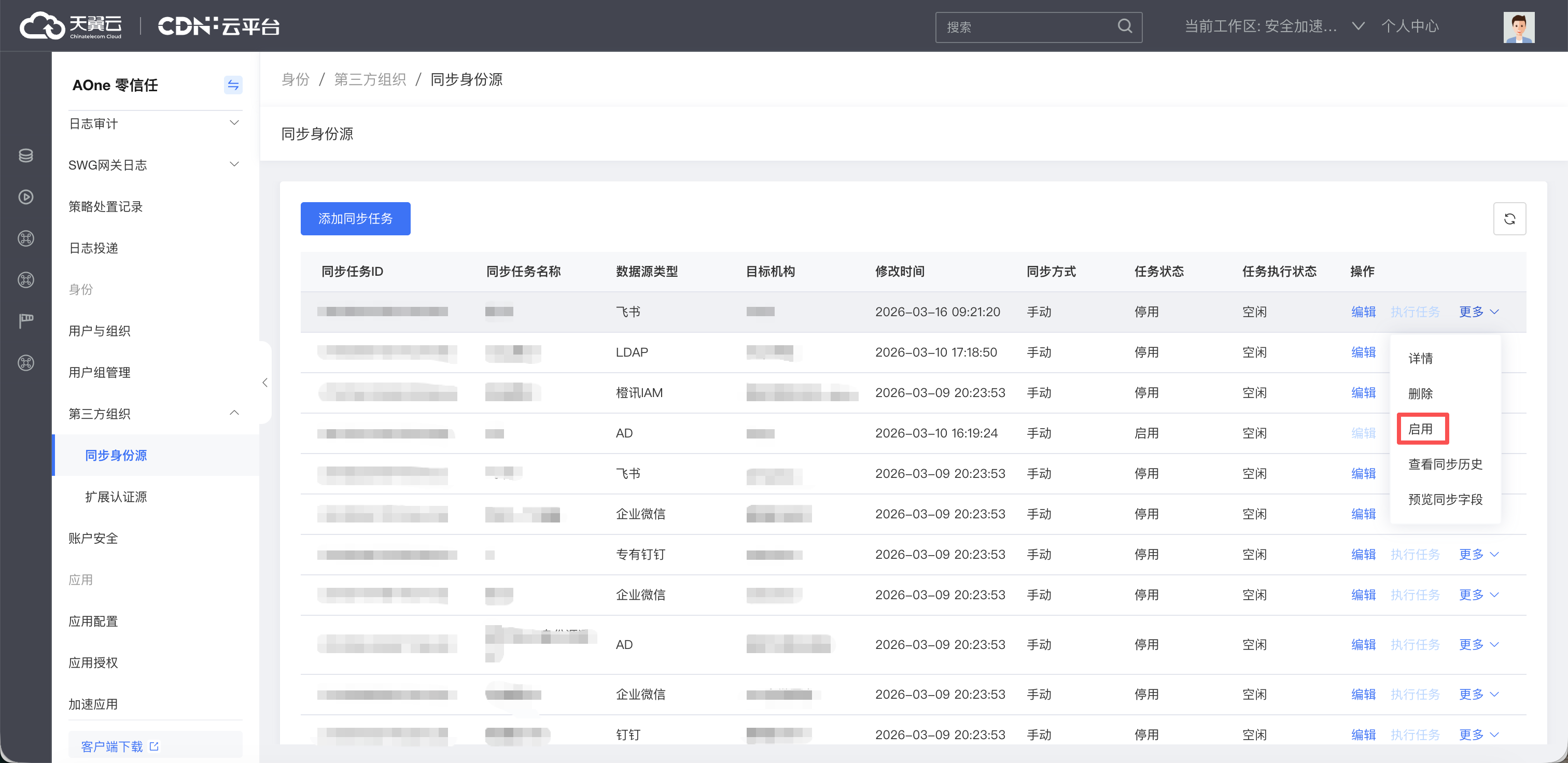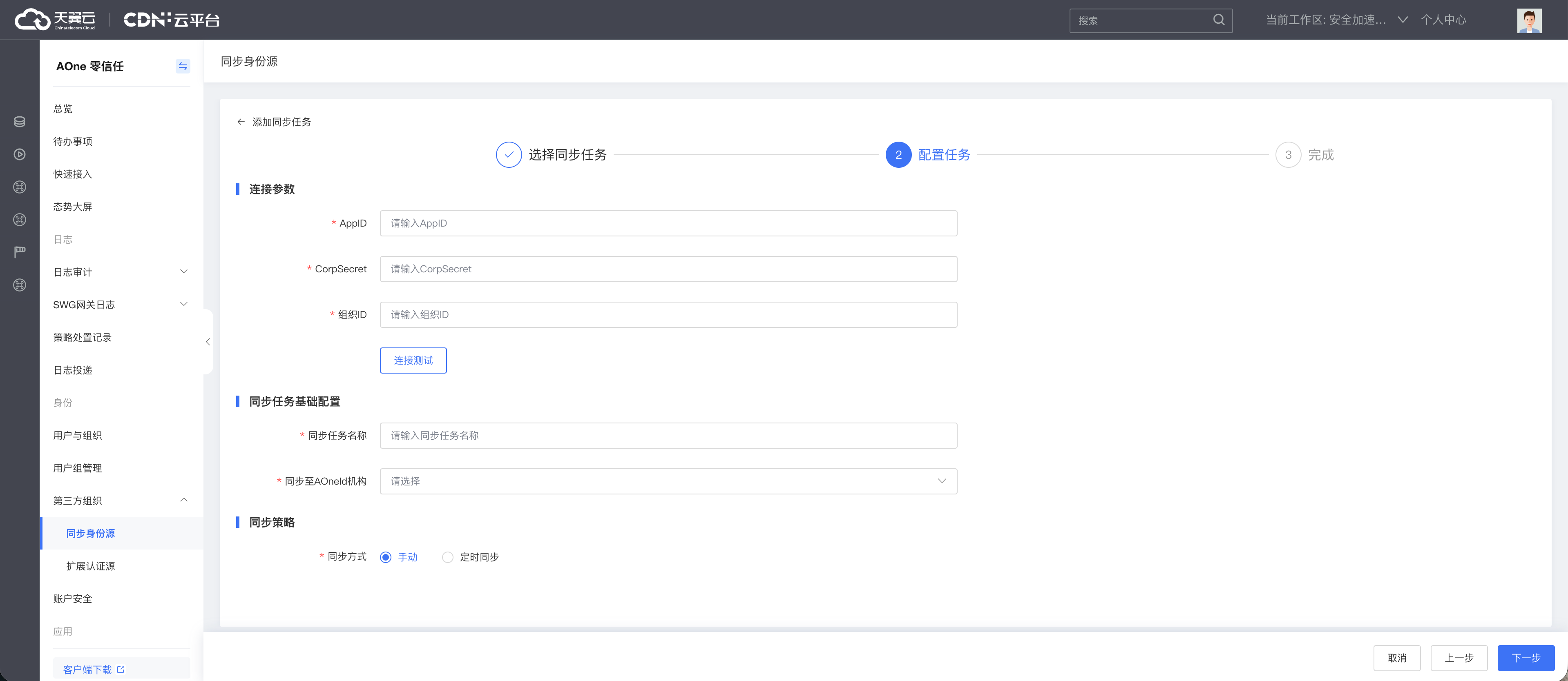 3. 在左侧导航栏身份-第三方组织,选择同步身份源菜单。