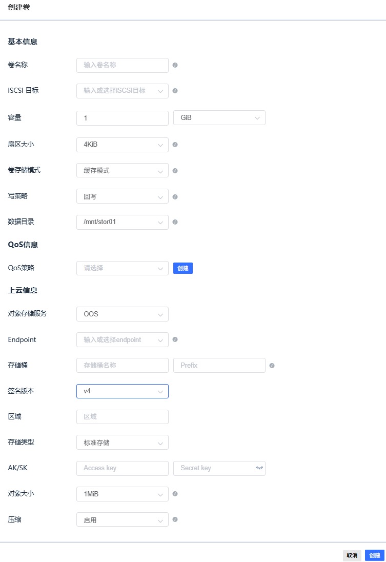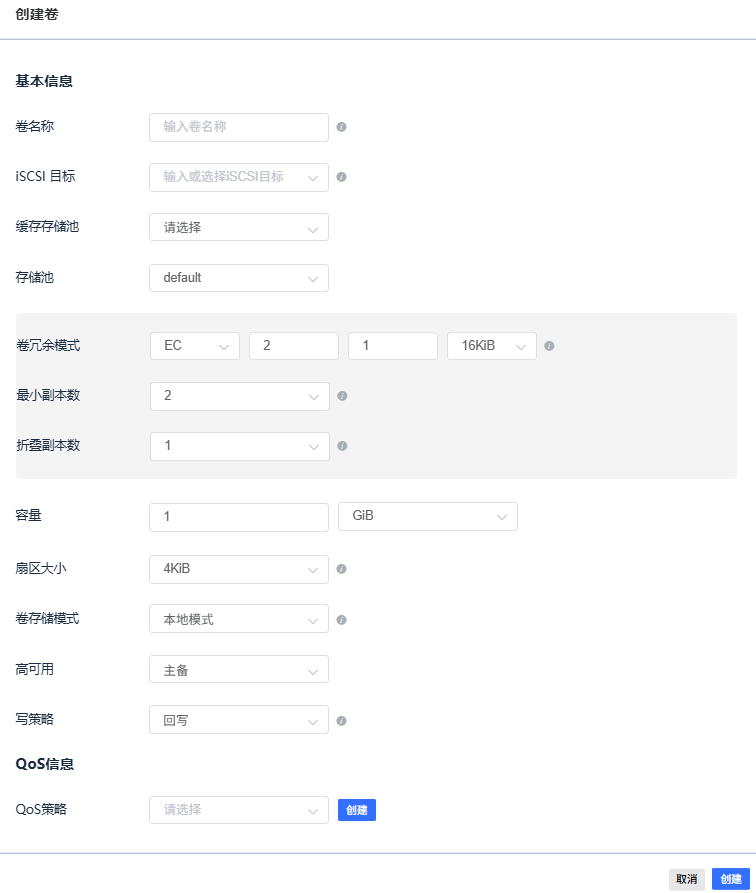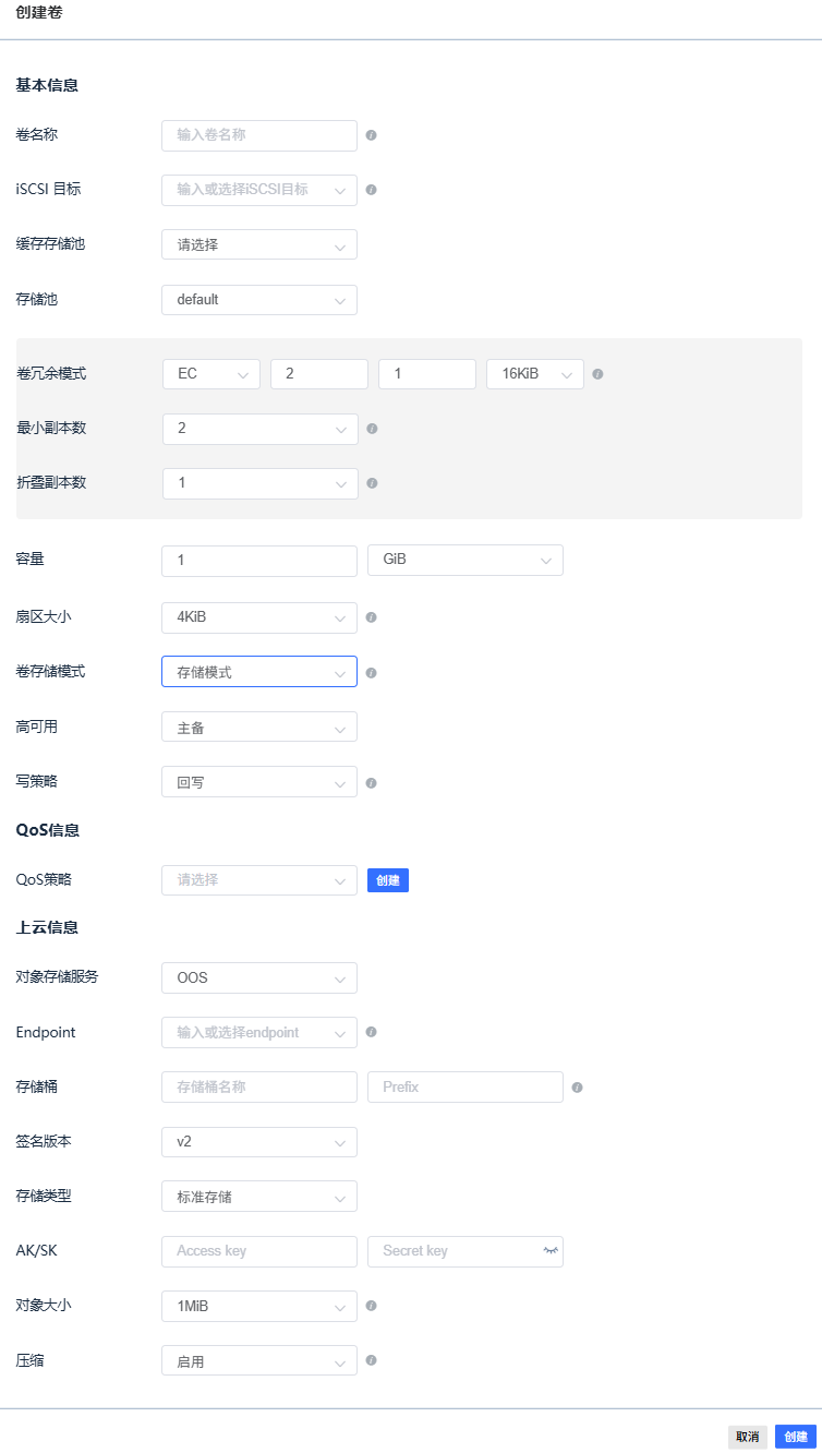 - 卷创建成功后,仅下列参数可以修改:卷容量、写策略、最小副本数(仅集群版支持)、折叠副本数(仅集群版支持)、Endpoint、签名版本、区域、AK/SK、是否压缩数据、QoS策略。