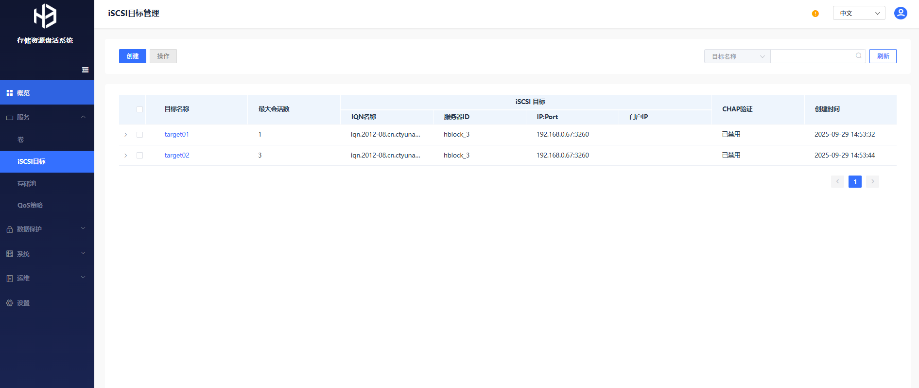 | 项目名称 | iSCSI目标名称。 说明 如果目标处于“删除中”,在目标名称前面会有黄色标注。 | |