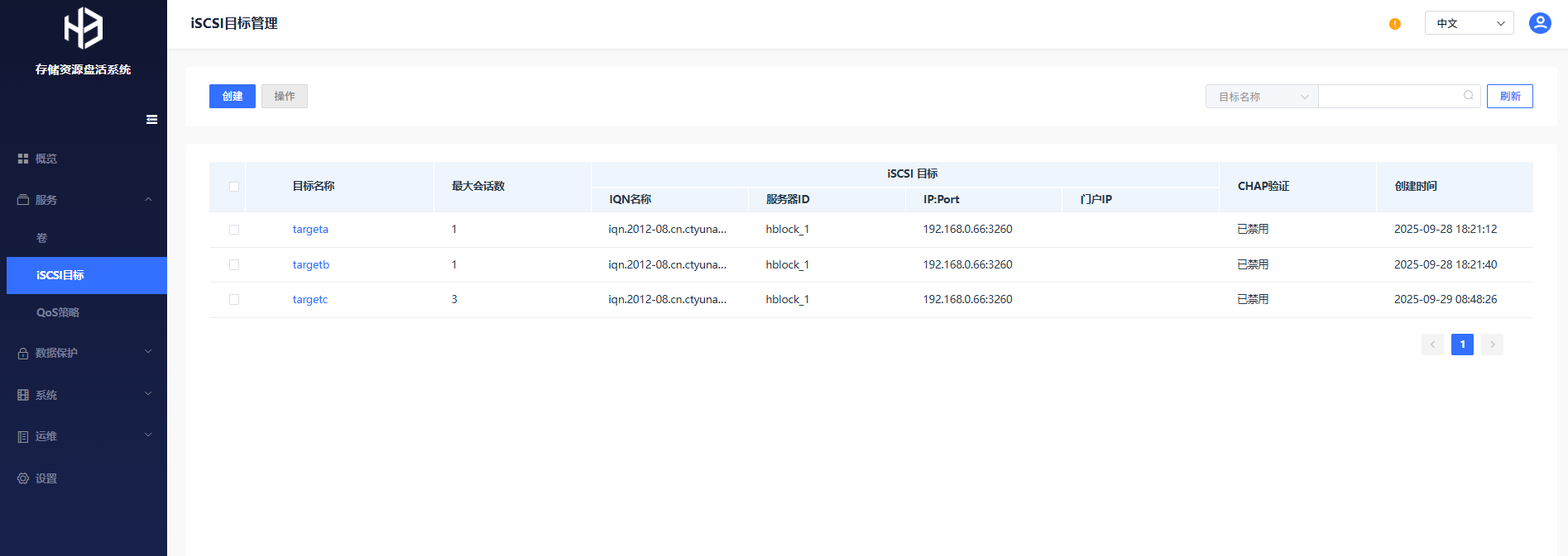 点击导航栏中的“服务”>“iSCSI目标”,进入“iSCSI目标管理”。在“iSCSI目标管理”页面,可以查看iSCSI目标相关信息。可以通过“目标名称”、“IQN名称”或“关联的卷”查找对应的iSCSI目标。