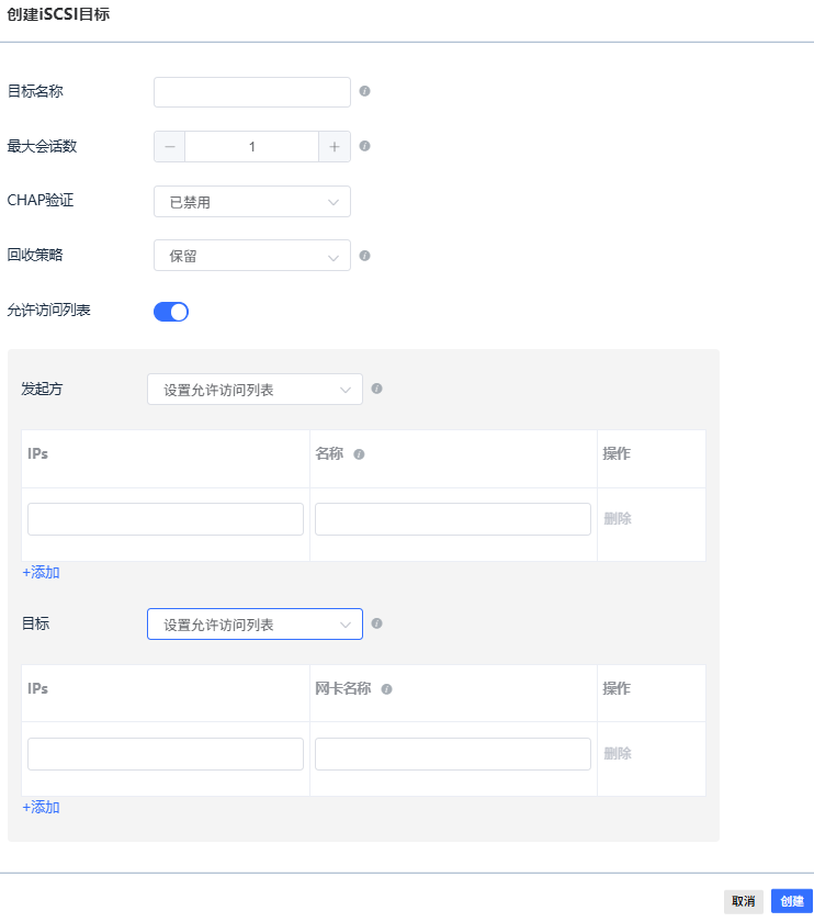在“iSCSI目标管理”页面,点击“创建”,可以创建iSCSI目标。