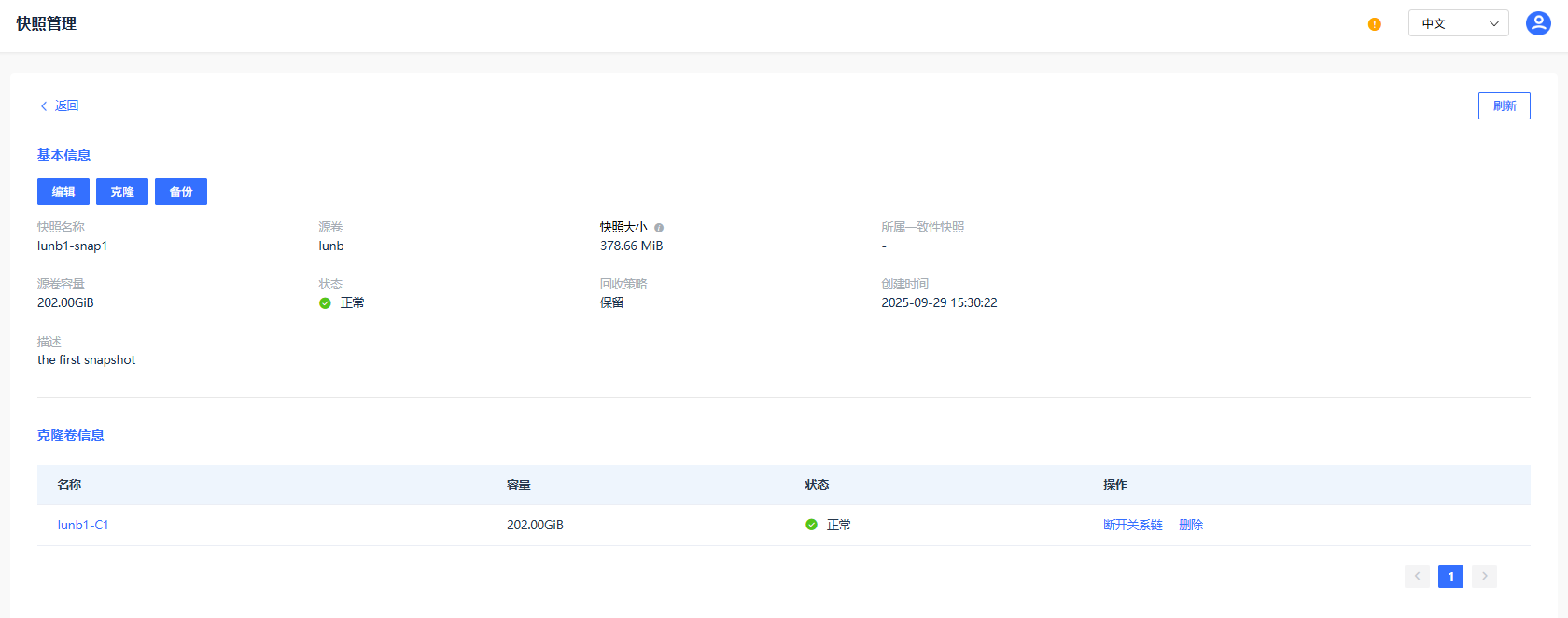 | 操作 | 点击“断开关系链”,可以断开克隆卷与快照的关系链。断开与快照的关联后,克隆卷为独立卷。详见断开克隆卷与快照的关系链。 点击“删除”,可以删除克隆卷。详见删除卷。 |