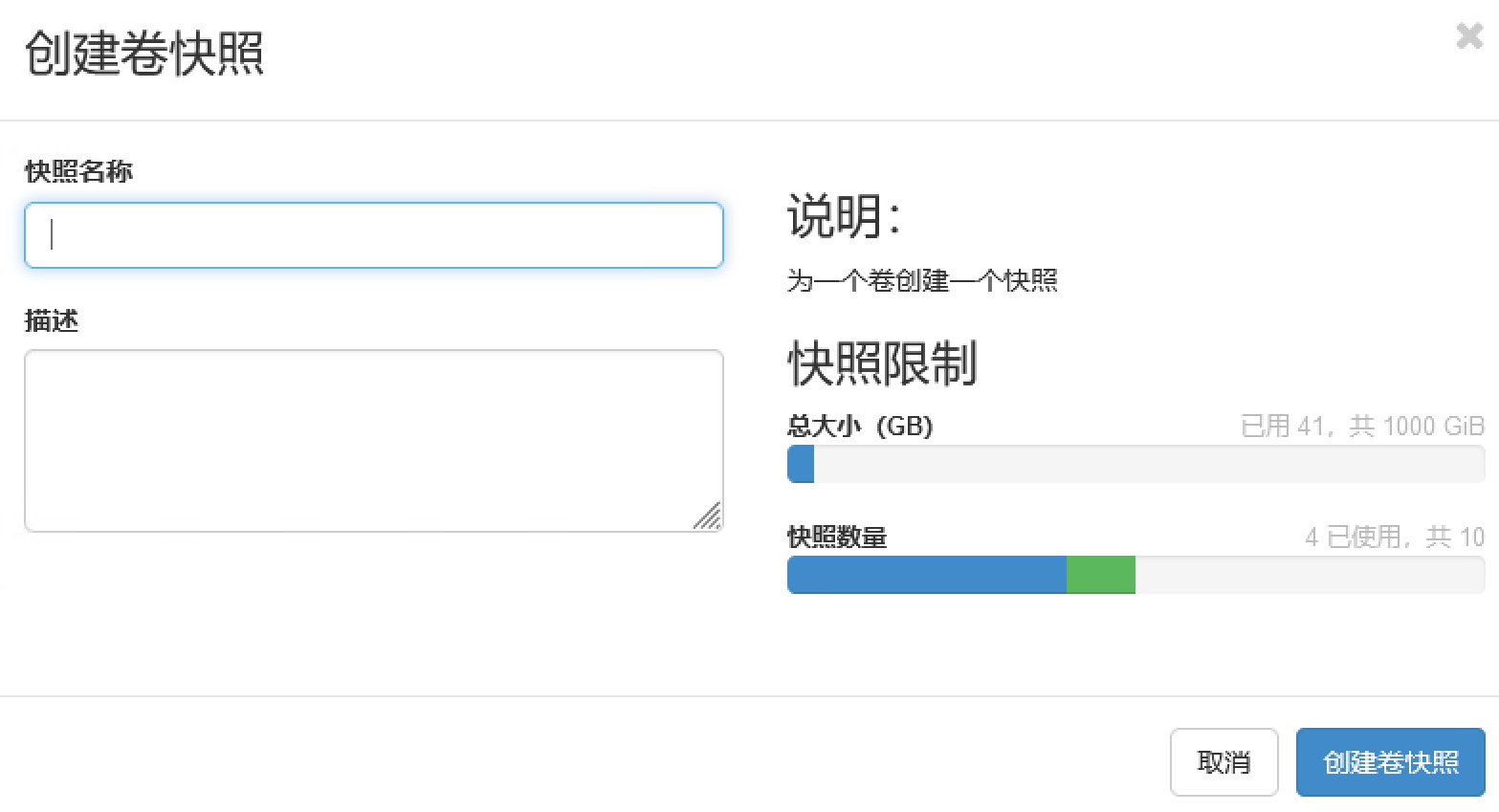 登录OpenStack,点击“卷”,选择需要创建快照的卷,再点击其“Actions”列的“创建快照”,弹出“创建卷快照”页面,即可为该卷创建快照。