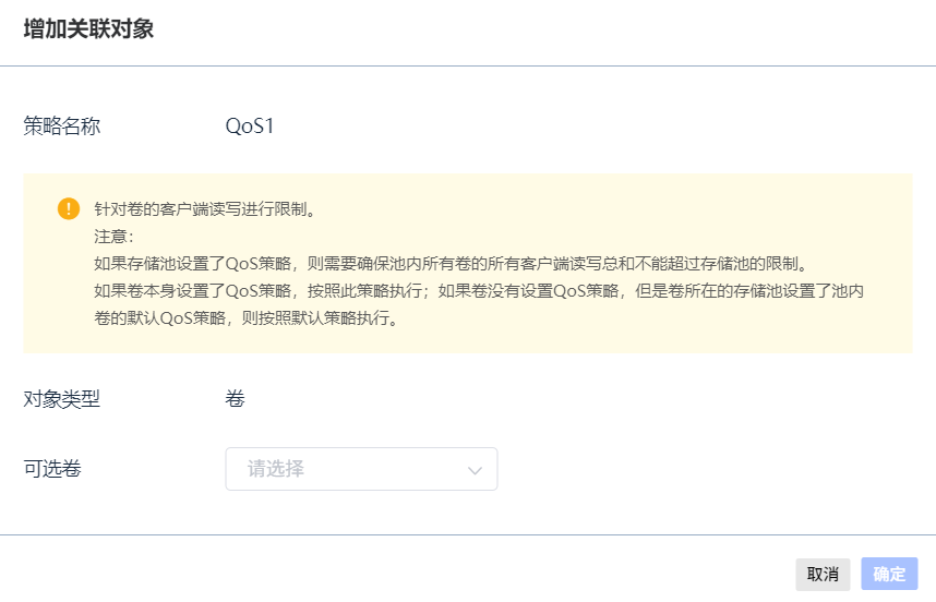 在“服务”>“QoS策略管理”页面,点击具体的QoS策略名称,进入QoS策略详细信息页面。在“关联详情”>“卷”下点击“增加关联对象”,选择需要关联QoS策略的卷即可。