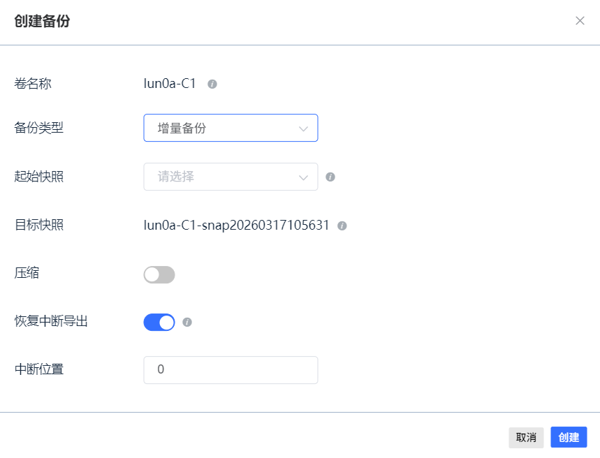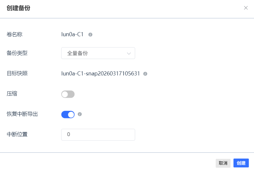 | 恢复中断导出 | 如果在导出备份文件的过程中意外中断,可以从断点处恢复中断的备份任务,此时需要指定中断位置,值为已经导出的备份文件的有效分片文件大小。 |