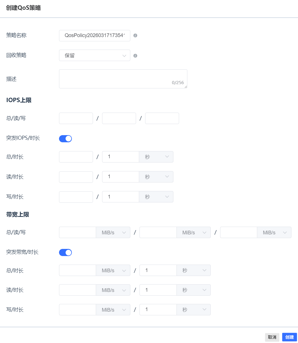 | 写/时长 | 使用Burst功能时,写带宽上限/所能持续的时间。带宽的单位可以选择B/s、KiB/s、MiB/s、GiB/s、TiB/s,所能持续的时间单位可以选择秒、分、时。
