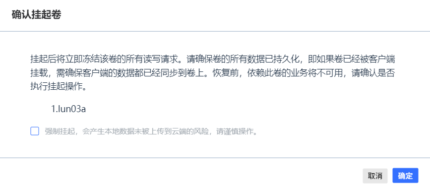 挂起后将立即冻结该卷的所有读写请求。请确保卷的所有数据已持久化,即如果卷已经被客户端挂载,需确保客户端的数据都已经同步到卷上。恢复前,依赖此卷的业务将不可用。