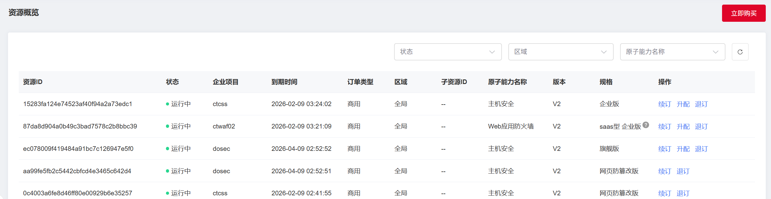 参数 说明 资源ID 购买原子能力资源的资源ID。 状态 资源的状态,包括开通中、运行中、已退订、部署失败、已过期。 企业项目 资源所属的企业项目,企业项目说明可参考企业项目管理。 到期时间 资源的到期时间。 订单类型 在控制台上购买的订单,类型为“商用”。 区域 资源所在区域。 子资源ID 若一个订单关联了多个v1.0版本的资源,则每个资源还可通过子资源ID进行标识。 原子能力名称 资源对应的原子能力的名称。 版本 原子能力的版本,V1或V2。 规格 原子能力的规格。