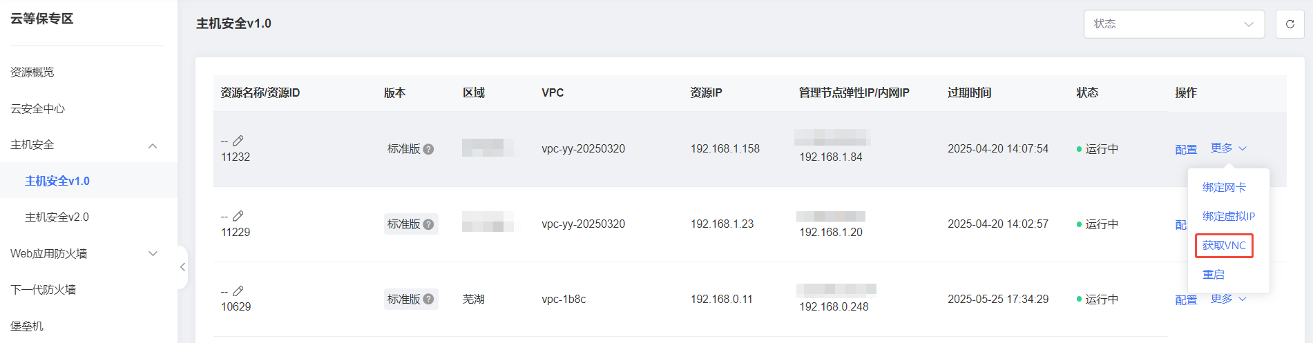 仅“一类节点”区域购买的v1.0资源支持在云等保专区控制台获取VNC地址。云等保专区支持的区域请参见支持的区域。