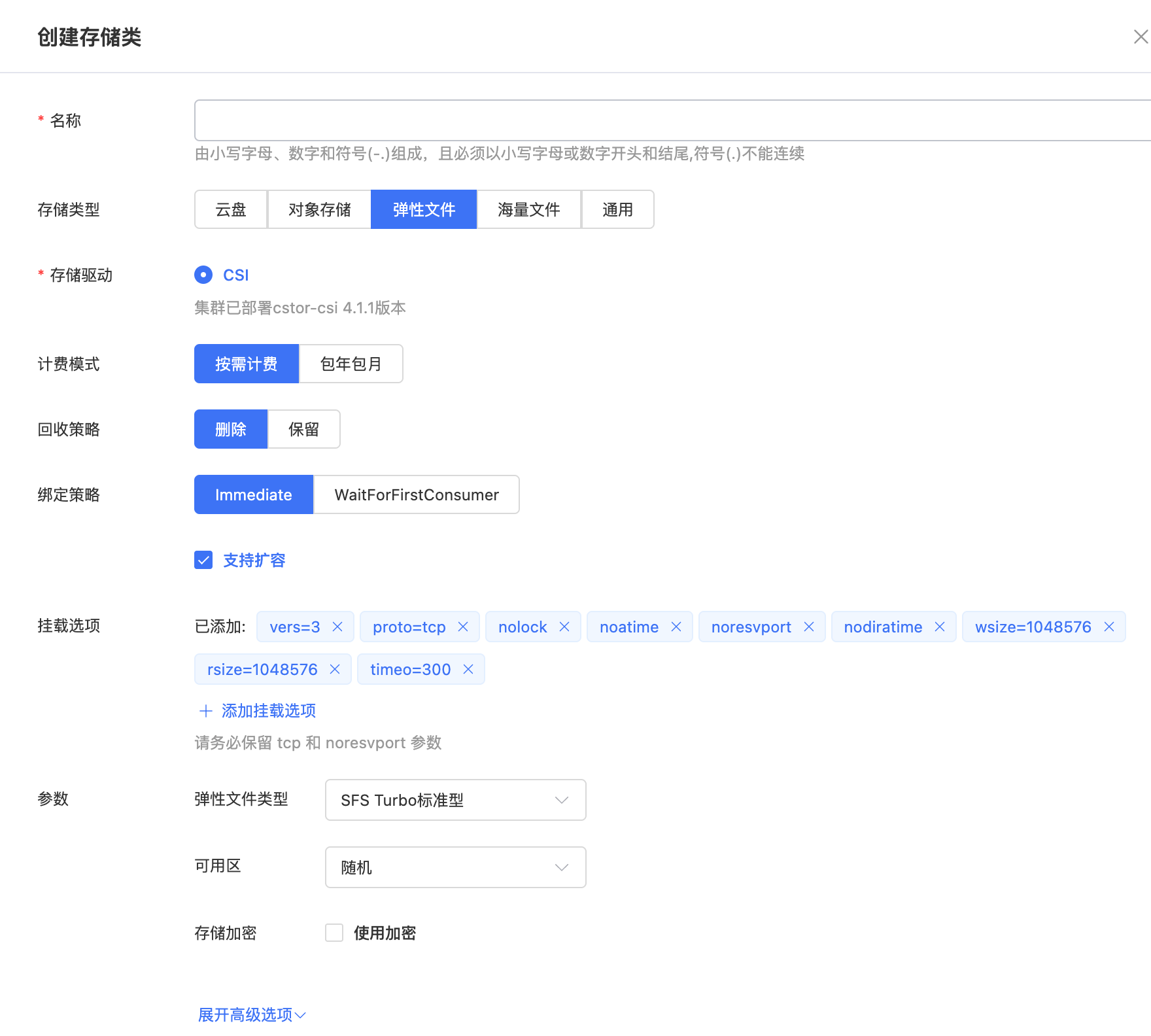 | 支持扩容 | 默认该开关是打开的,一般也建议打开。 如果关闭该开关,则使用该存储类的pvc,无法被扩容。 |