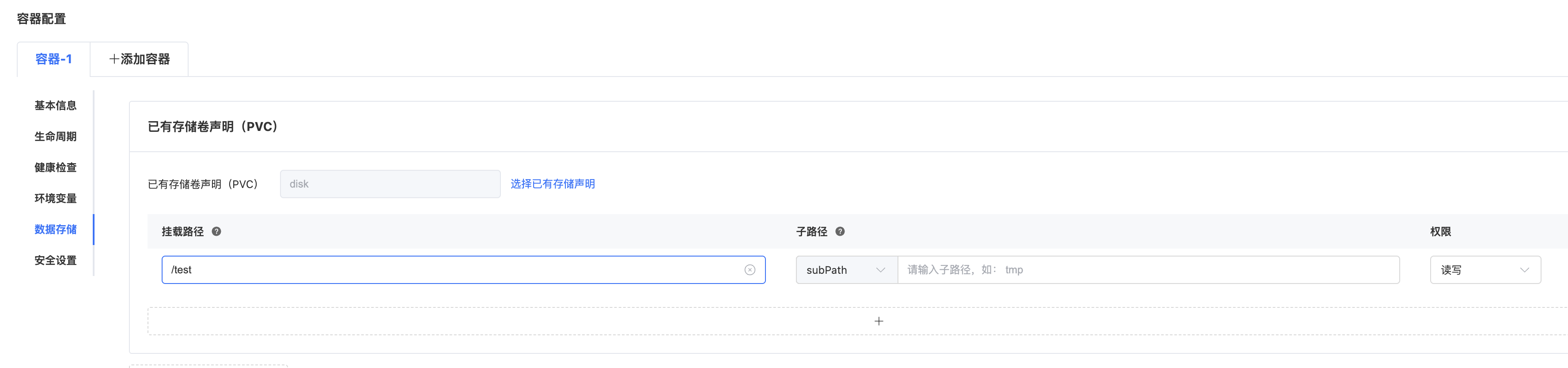 示例:将PVC“disk”对应存储的subpath指向的子目录(subpath为空表示使用根目录),挂载到容器里的/test路径上。