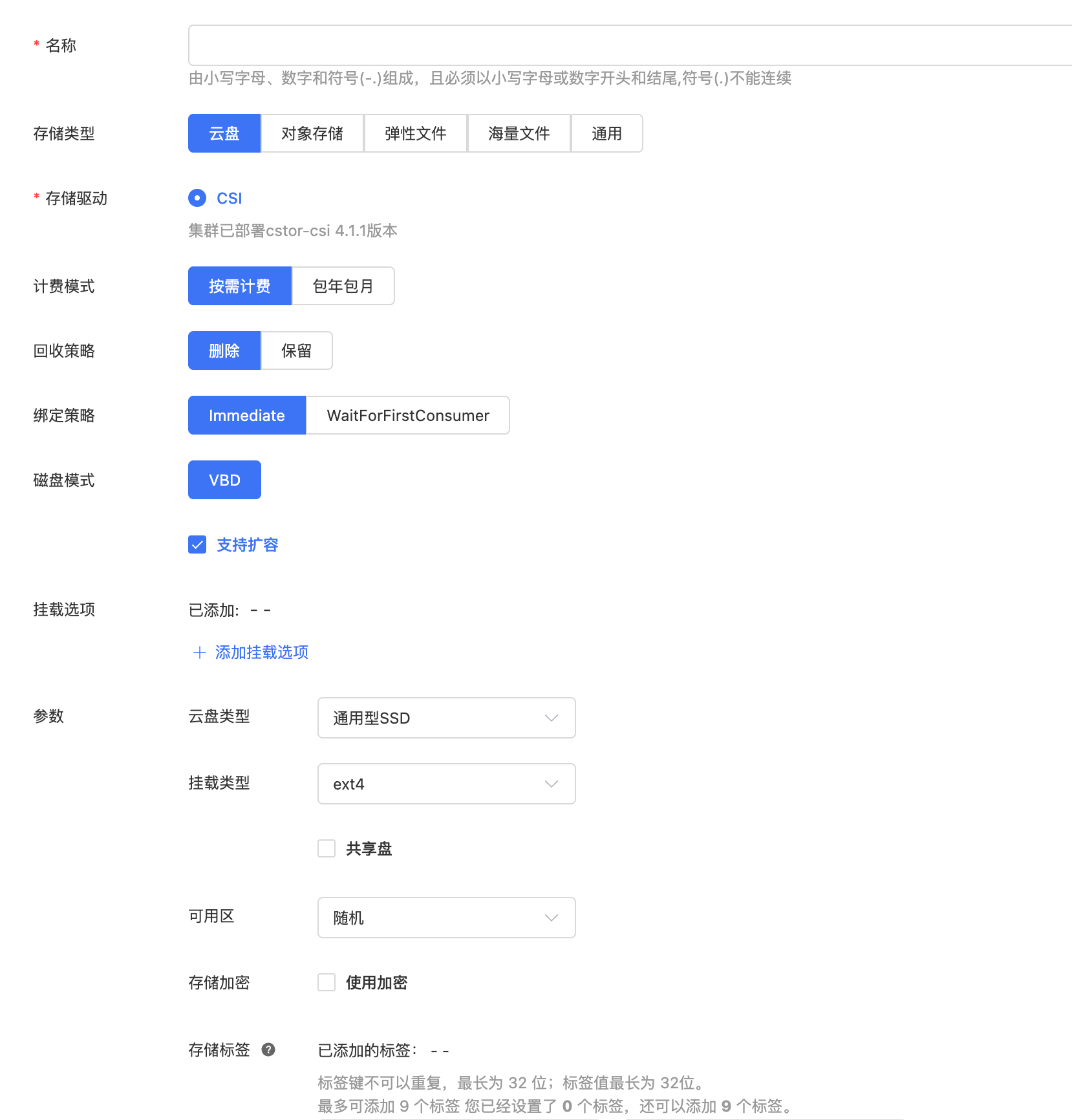 | 持久卷类型 | 当前支持云盘、弹性文件、对象存储、并行文件和海量文件,这里选择云盘。 具体创建页中展示的存储类型由当前资源池支持情况决定。 |