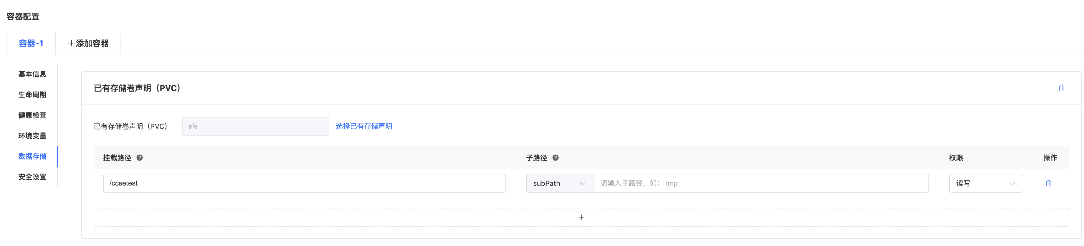 在创建对话框,数据存储栏中,选择添加存储卷,卷类型选择“已有存储卷申明(PVC)”,操作栏选择“选择已有存储申明”;根据自己需要设置挂载路径、子路径和权限,