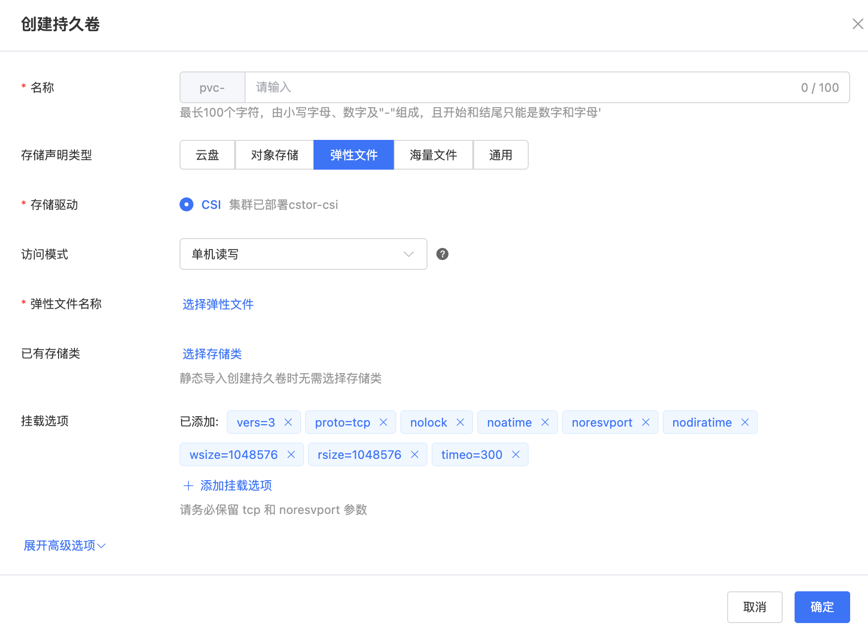 配置项 说明 名称 PVC的名称。 存储声明类型 当前支持云盘、弹性文件、对象存储、并行文件和海量文件,这里选择弹性文件。