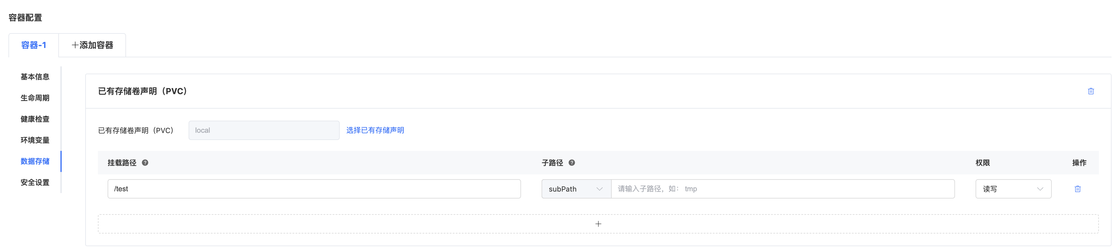 在创建对话框,数据存储栏中,选择添加存储卷,卷类型选择“已有存储卷申明(PVC)”,操作栏选择“选择已有存储申明”;根据自己需要设置挂载路径、子路径和权限,