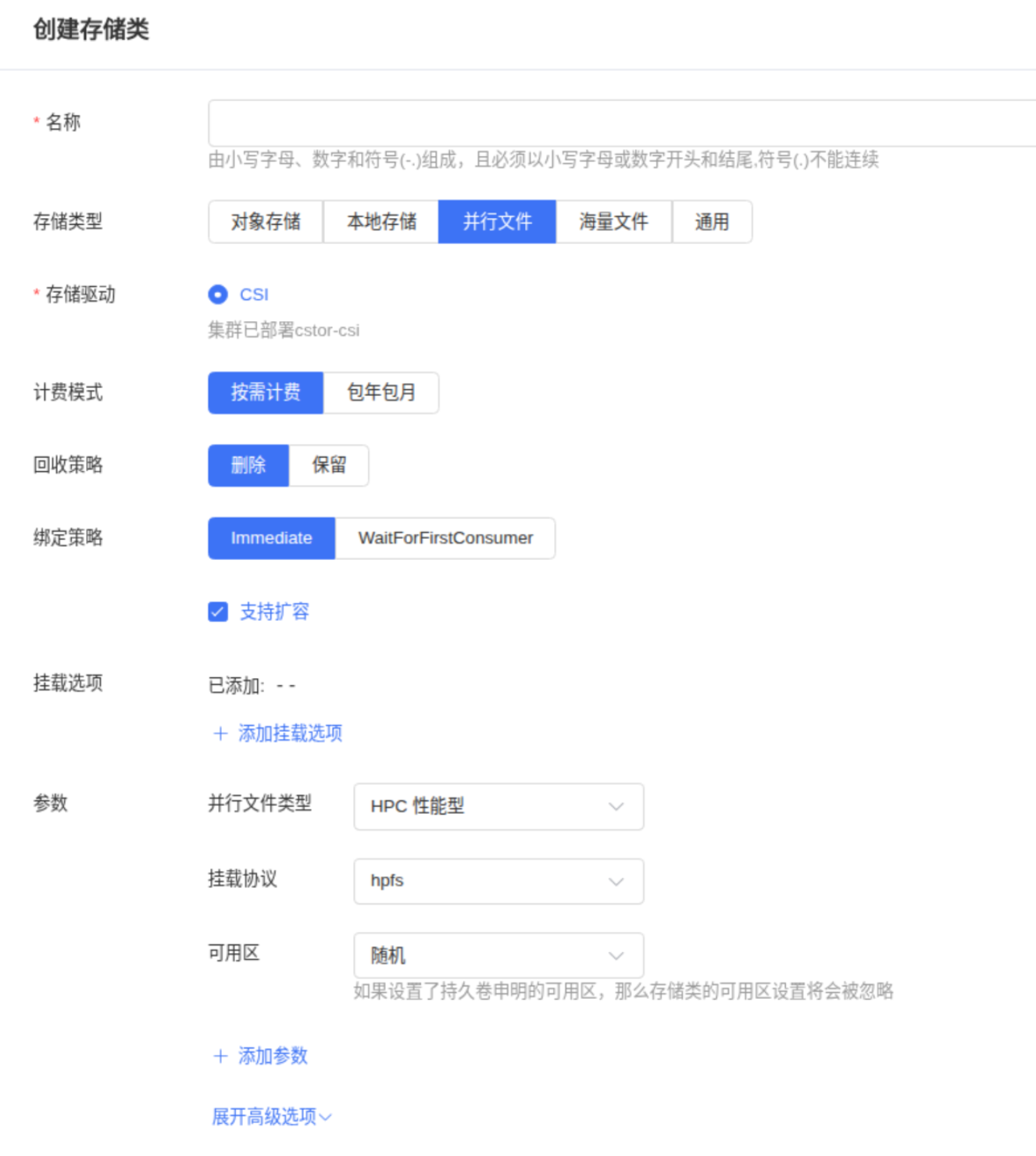 | 支持扩容 | 默认该开关是打开的,一般也建议打开。 如果关闭该开关,则使用该存储类的pvc,无法被扩容。 |