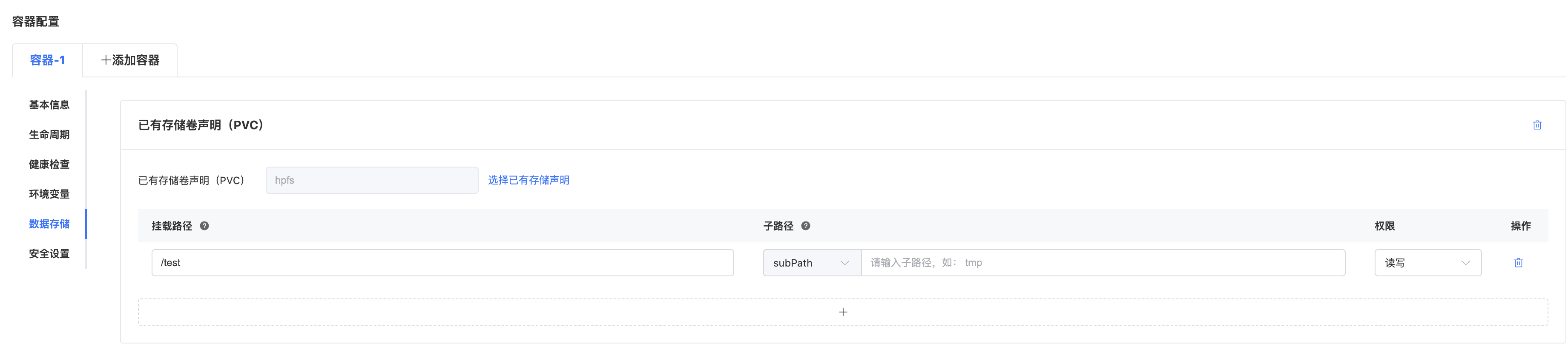 示例:将PVC“hpfs”对应存储的subpath指向的子目录(subpath为空表示使用根目录),挂载到容器里的/test路径上