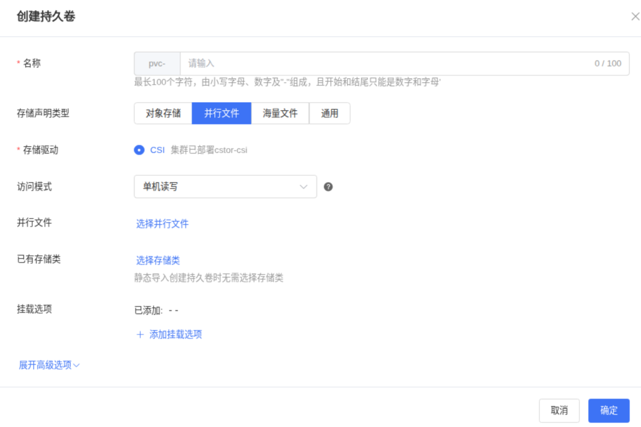 | 持久卷类型 | 当前支持云盘、弹性文件、对象存储、并行文件和本地存储,这里选择并行文件。 具体创建页中展示的存储类型由当前资源池支持情况决定。 |