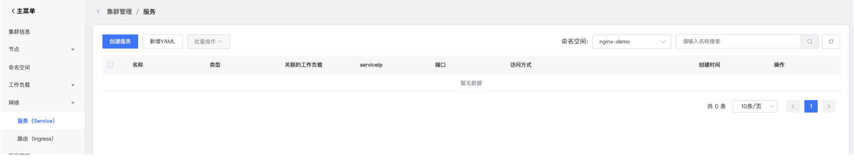 Pod销毁重建后,其IP地址也会变化,例如deployment工作负载升级时,新建的pod地址会改变。Kubernetes的Service可提供一个固定的IP地址(来自订购集群时配置的服务网段)和Service域名,结合标签选择器,对一组pod做负载均衡。客户端可通过该地址或域名访问IP地址可变的pod。如下图所示,nginx部署的前端服务,通过service地址访问后端服务.