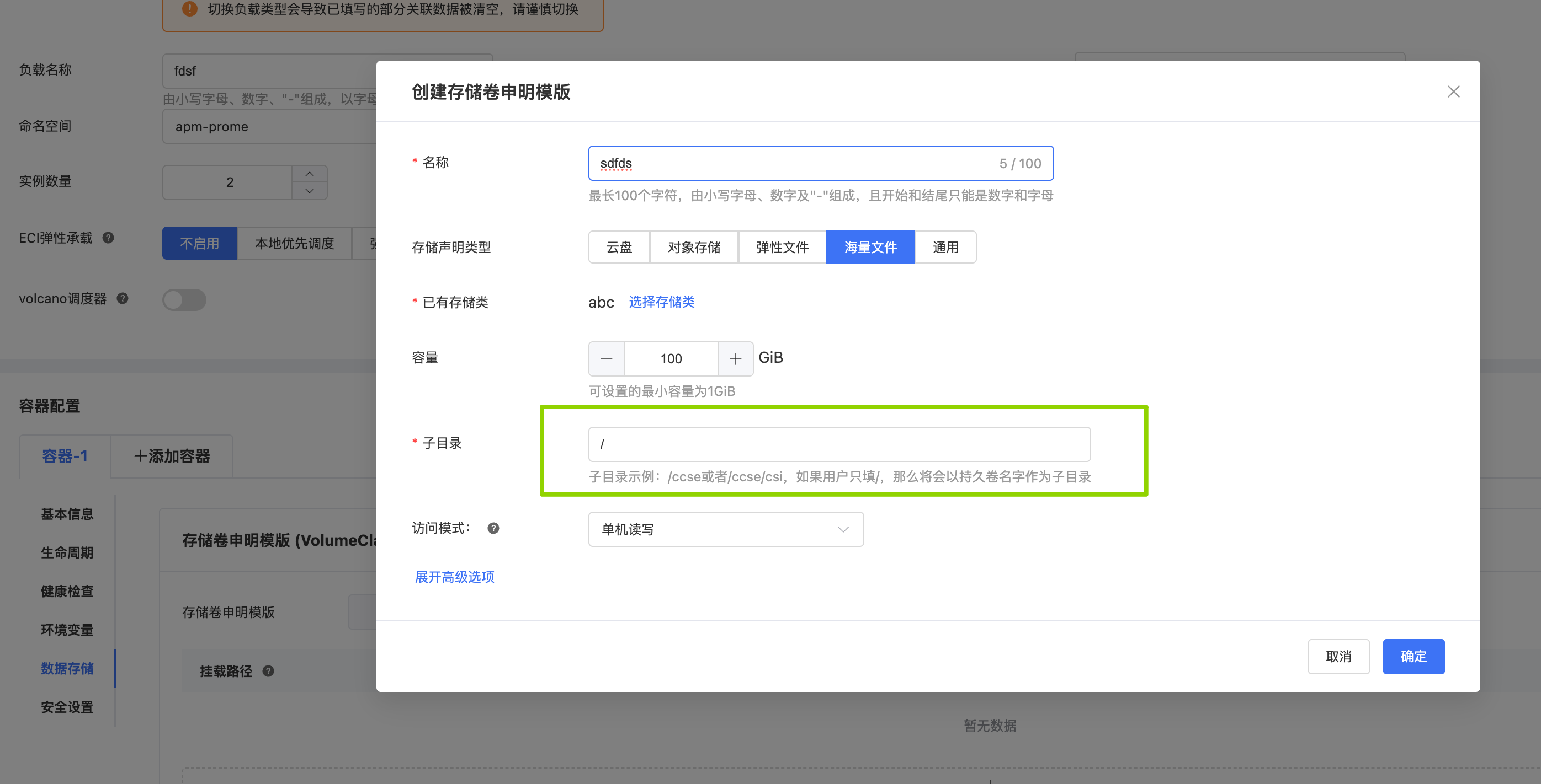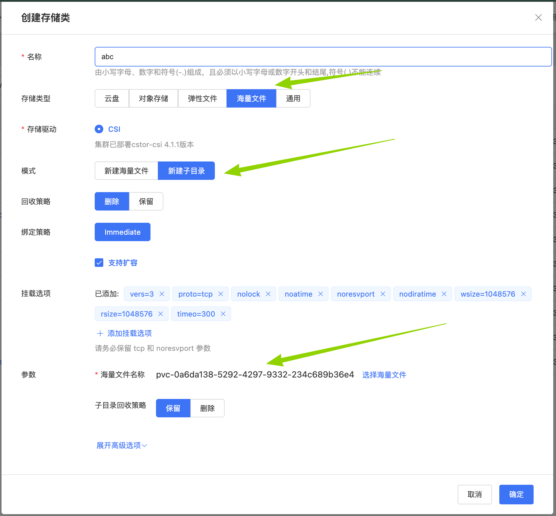 (2)动态分配子目录:用户使用海量文件存储时,每次可为不同工作负载动态分配一个子目录作为独立PVC。(注:此功能仅海量文件存储支持,其他存储产品不适用于子目录挂载场景。)