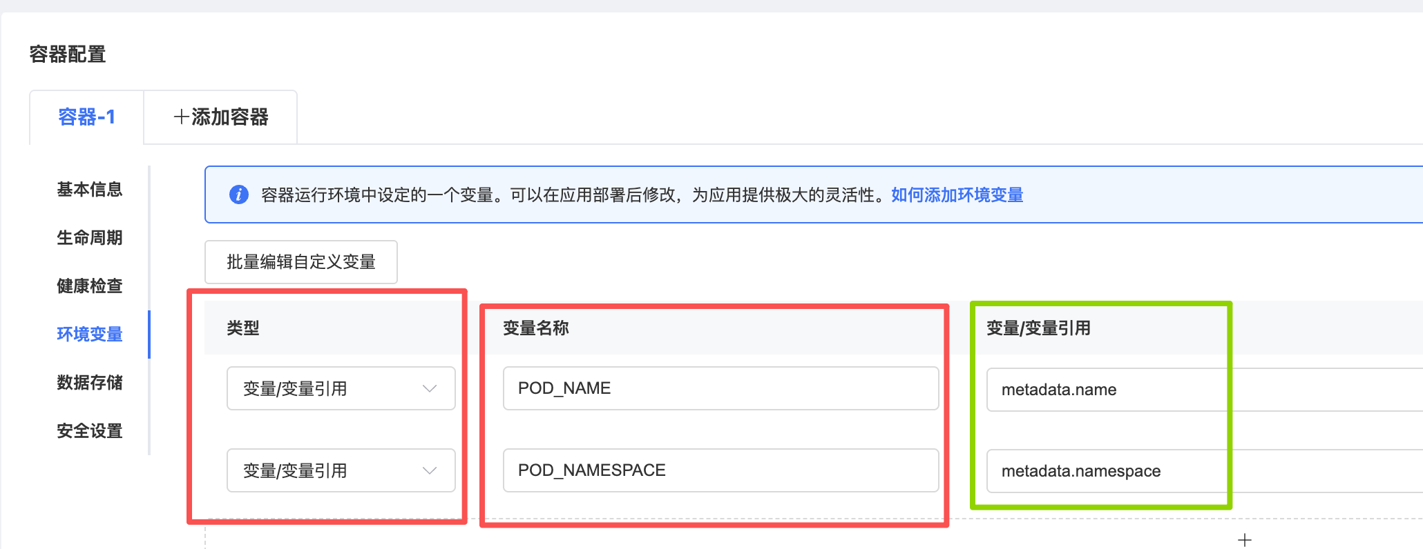 根据以上示例,红框处需正确填写变量名,绿框处需选择变量值的来源。即从Pod的metadata.name字段获取POD_NAME变量值,从metadata.namespace字段获取POD_NAMESPACE变量值,并组合为存储的子目录路径。