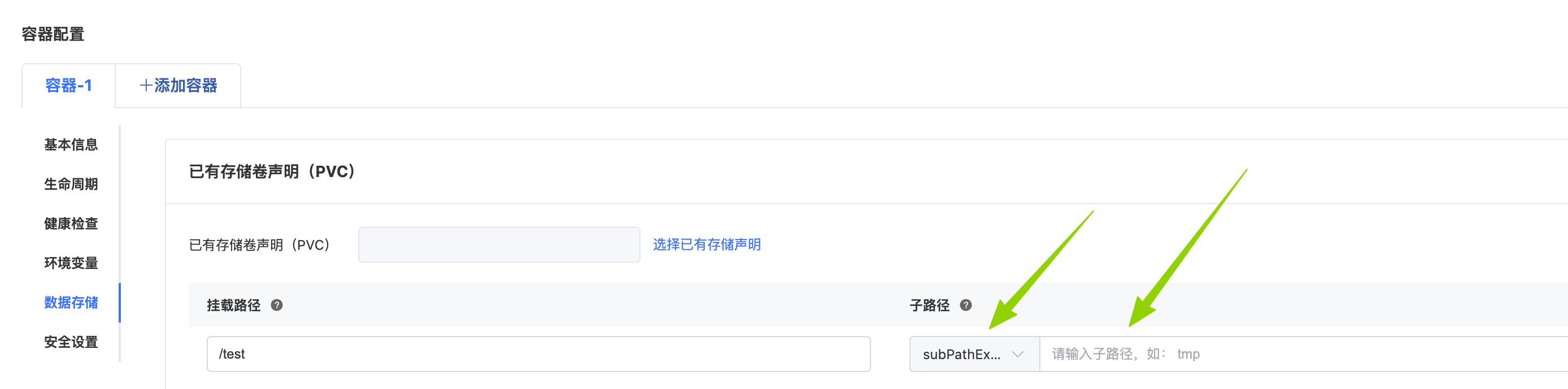 若选择 subPath,直接填写子目录名称即可;若目录不存在,K8S会自动创建。若选择 subPathExpr,需按以下方式配置:
