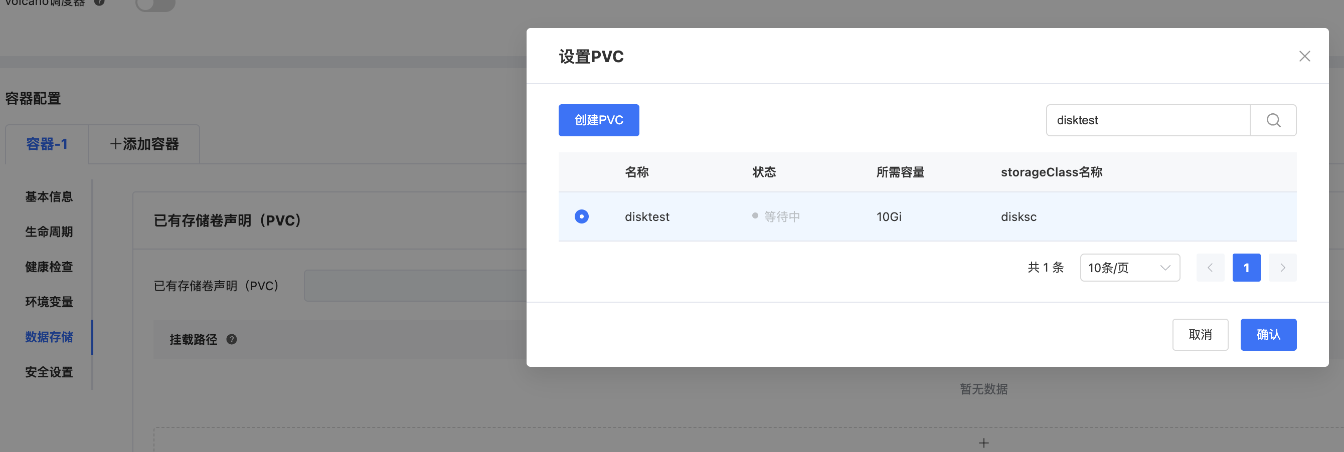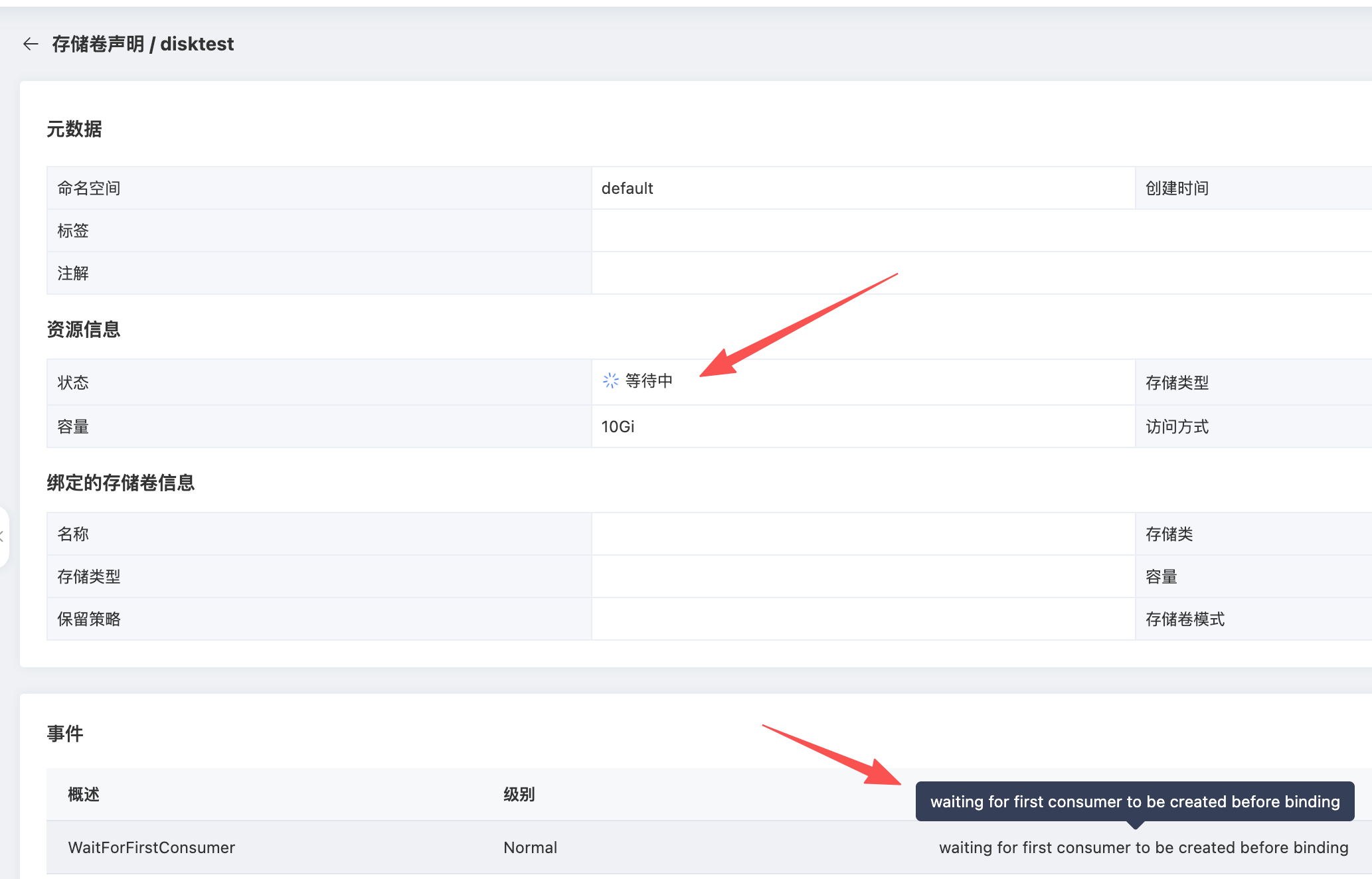 创建持久卷申明时,选择这个新的存储类,可以看到持久卷申明,状态会一直处于等待中,事件也是等待动态分配的状态。此时需要新建一个工作负载使用该PVC。