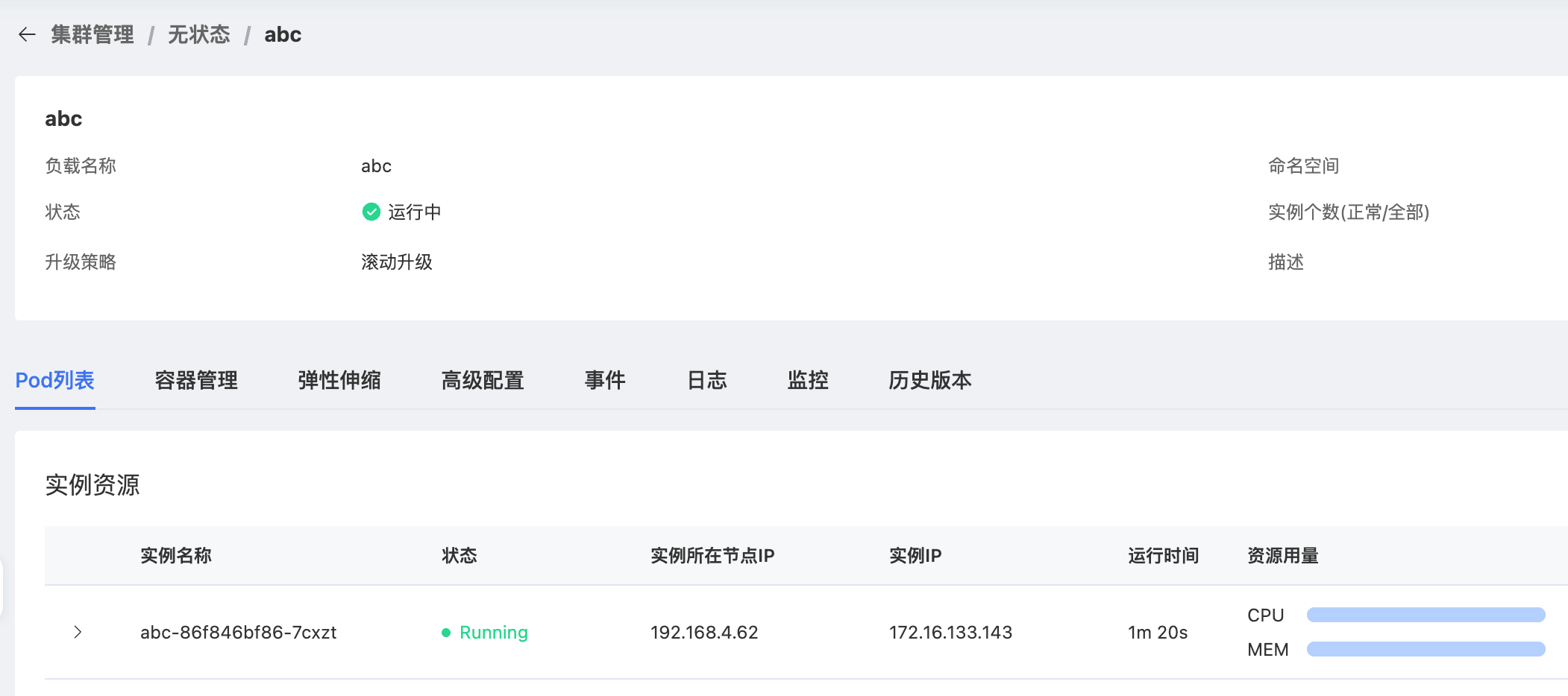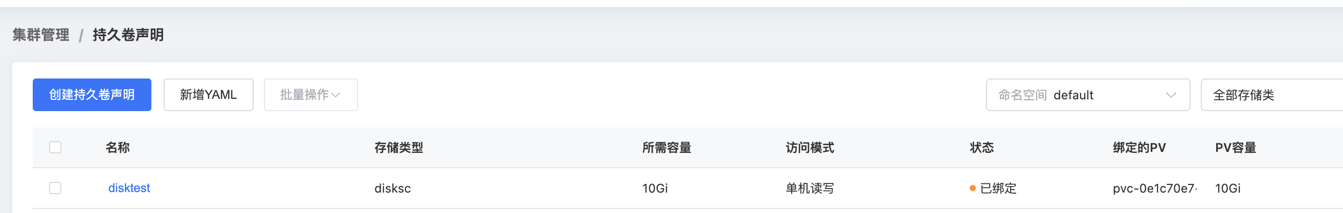 一段时间后可见,持久卷申请已成功绑定,无状态工作负载启动正常,云盘正常挂载。通过存储控制台查询可确认存储所在可用区与工作负载的可用区保持一致。