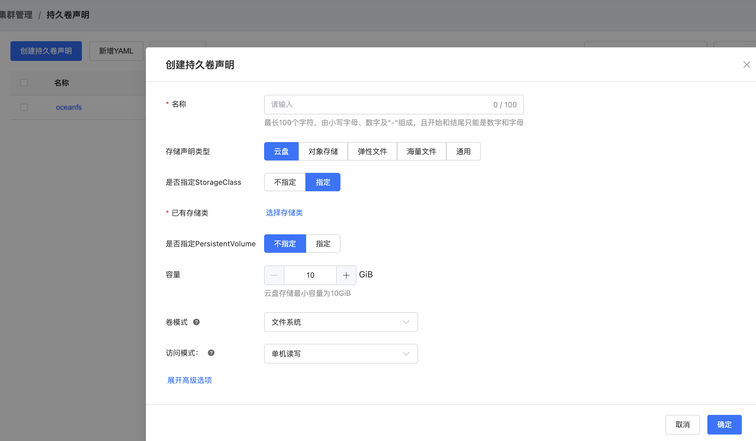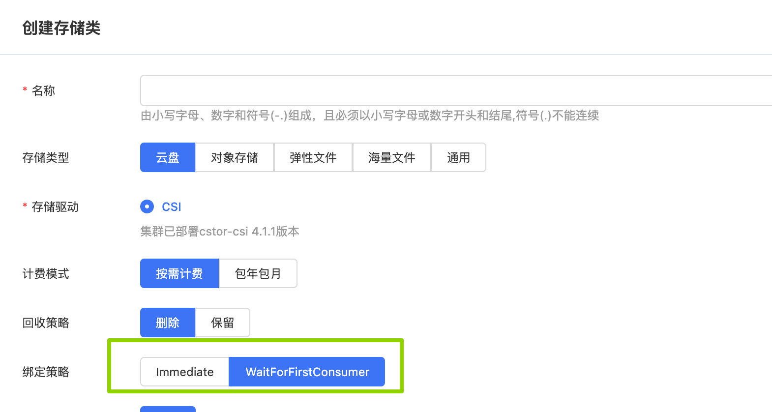 创建一个新的存储类时,需根据实际需求选择存储产品并填写相关参数。在“绑定策略”一栏中,请选择延迟绑定(WaitForFirstConsumer)。