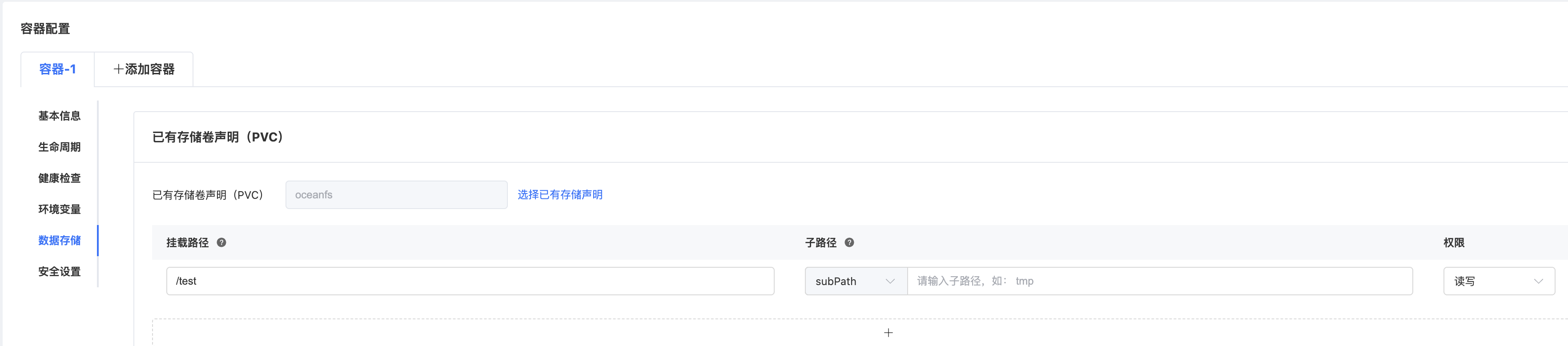在创建对话框,数据存储栏中,选择添加存储卷,卷类型选择“已有存储卷申明(PVC)”,操作栏选择“选择已有存储申明”;根据自己需要设置挂载路径、子路径和权限,