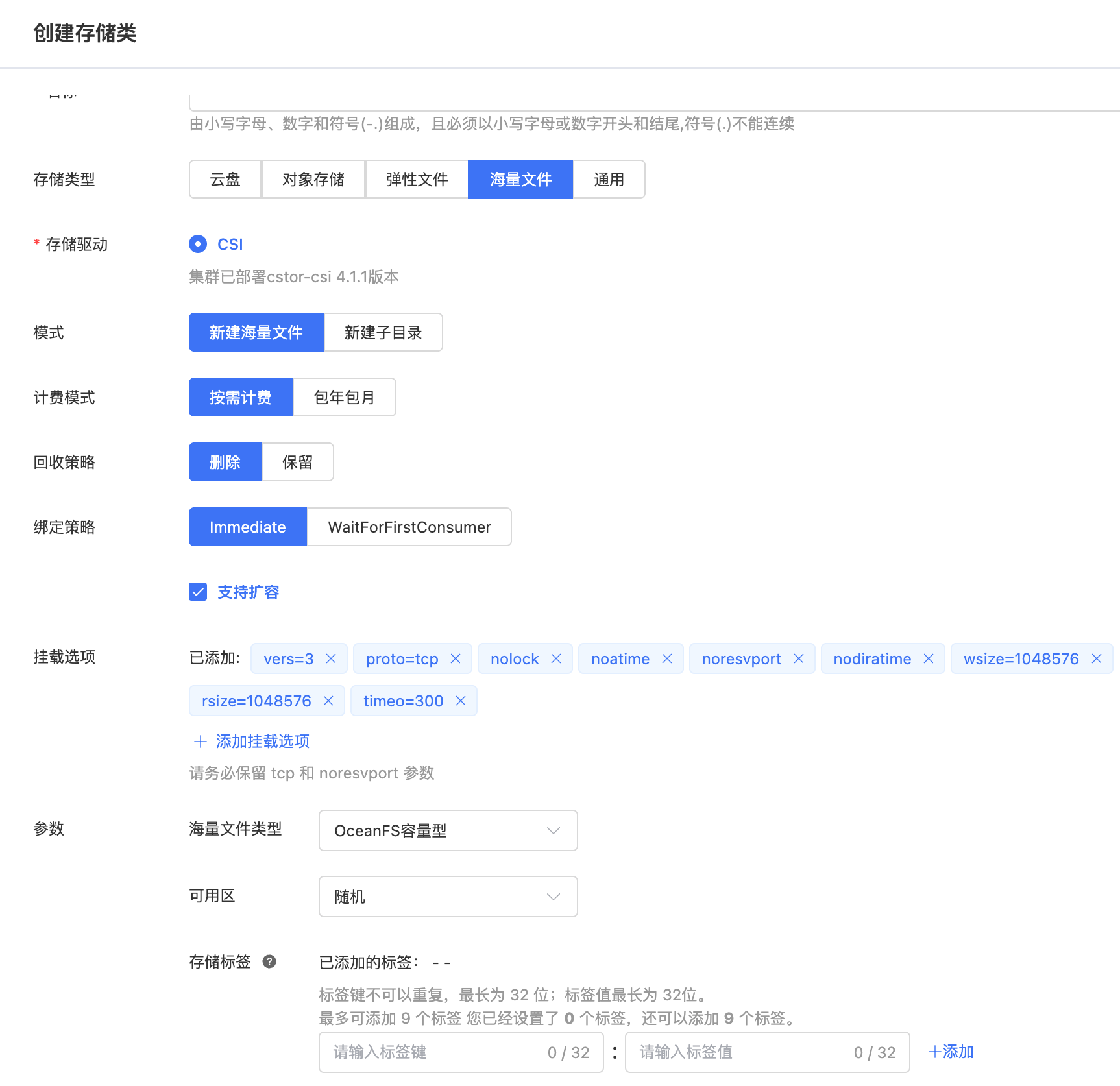 | 存储声明类型 | 当前支持云盘、弹性文件、对象存储、并行文件、海量文件,这里选择海量文件。 具体创建页中展示的存储类型由当前资源池支持情况决定。 |