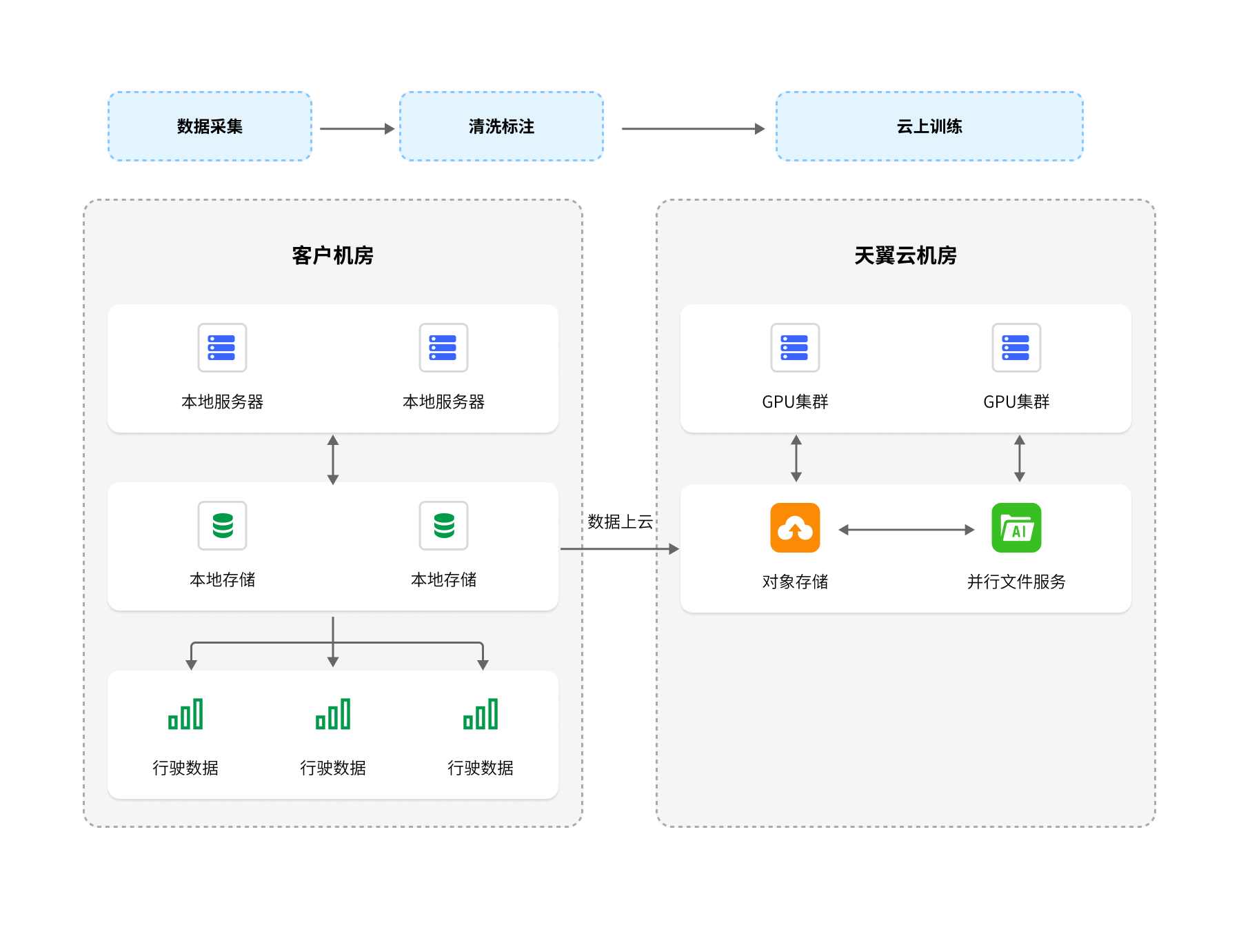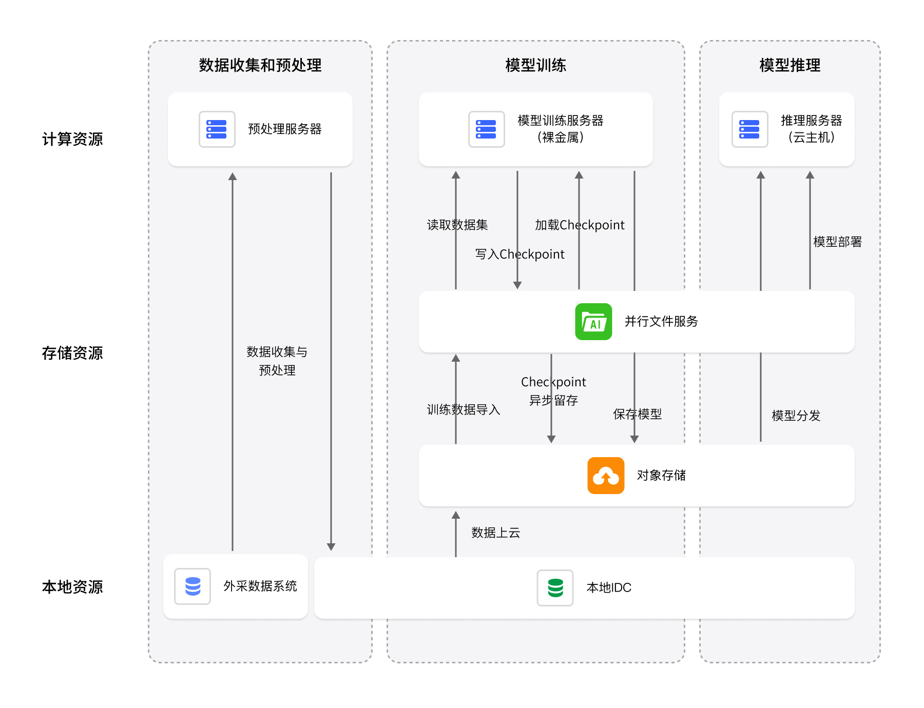 将HPFS、NAS等多个存储产品组合与GPU云主机、弹性裸金属等计算集群无缝对接。通过容器化部署服务实现资源弹性调度,提供超高吞吐和超高IOPS能力,支持混合云、线下和云上部署,快速构建AI基础环境。