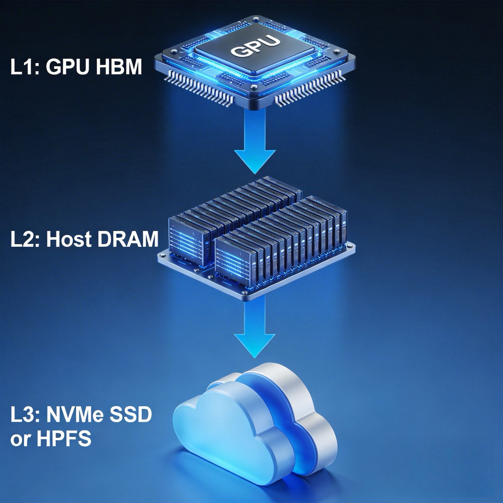 HPKV 系统构建了 GPU HBM → Host DRAM → Local NVMe SSD 或 Remote Storage/HPFS 的多级存储体系,通过跨请求的 KV Cache 深度复用,践行“以存代算”理念,有效消除推理服务中的冗余计算开销,显著降低首Token延迟(TTFT)并提升吞吐量,同时降低算力成本。通过智能沉降与基于热度、存储时长、容量的多策略驱逐机制,在各级存储间自动流转数据,精准淘汰冷数据,实现效率与成本的最优平衡。
