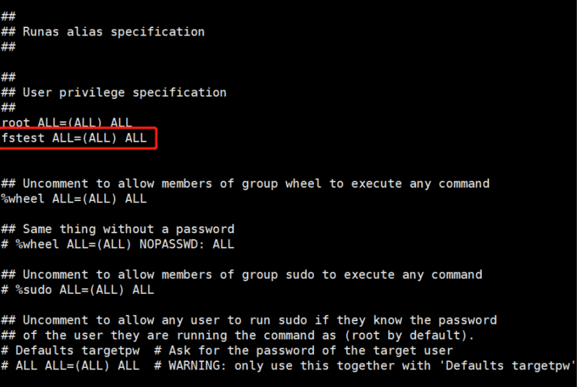 adduser fstest passwd fstest执行 chmod 777 /etc/sudoers命令修改sudoers文件权限为可编辑权限。在root账号下执行