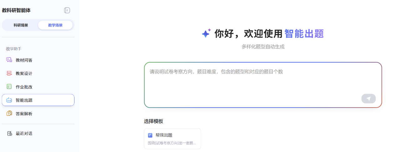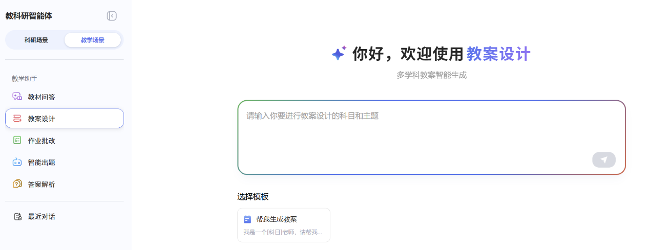 在【科研智能体】页面中,单击左上角的【教学场景】。