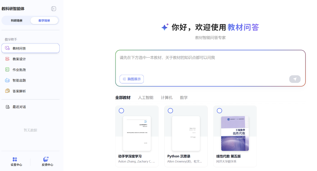 功能说明:聚焦教材内容的智能问答助手,即时响应疑问,助力高效学习和备课。同时支持教材知识图谱生成。