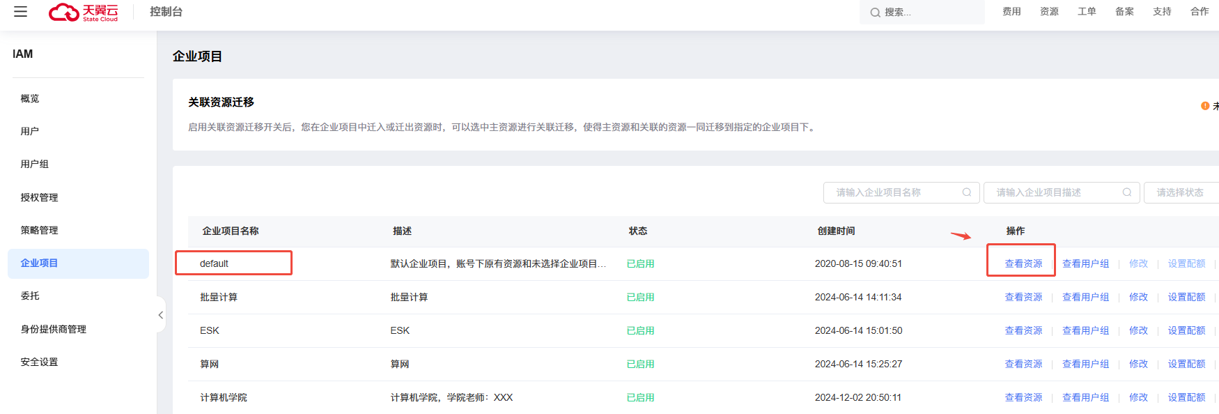 2. 在IAM控制台-企业项目中,选择当前的default企业项目,点击“查看资源”