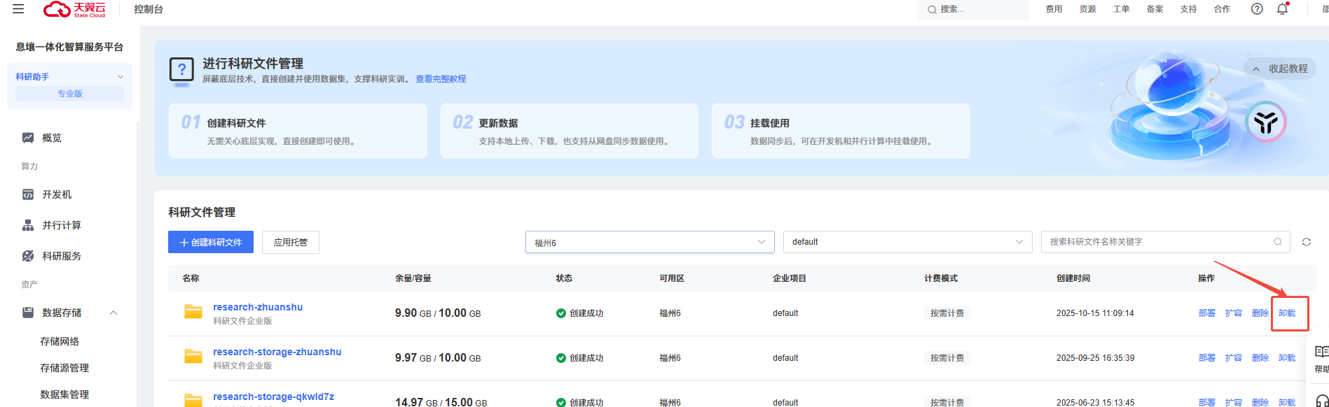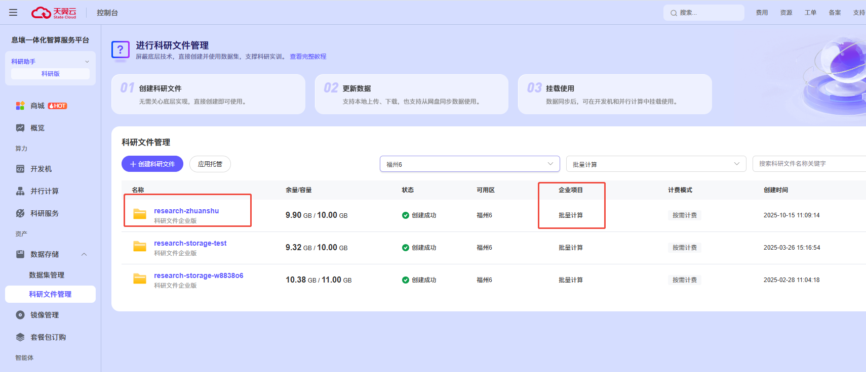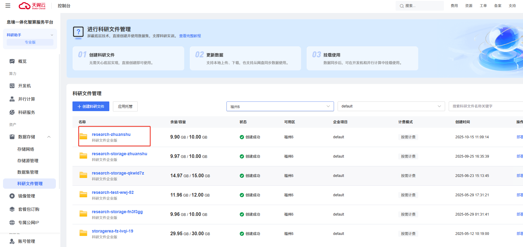 1、在科研助手控制台中,点击数据存储-科研文件管理,这里以"research-zhuanshu"为例,当前该科研文件隶属于default企业项目。