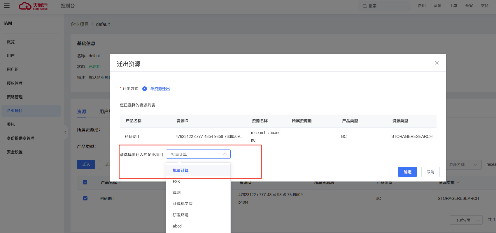3. 可在右侧搜索您要迁出的资源,如"research-zhuanshu",选中后点击“迁出”,这里选择迁出至“批量计算”,然后点击确认。