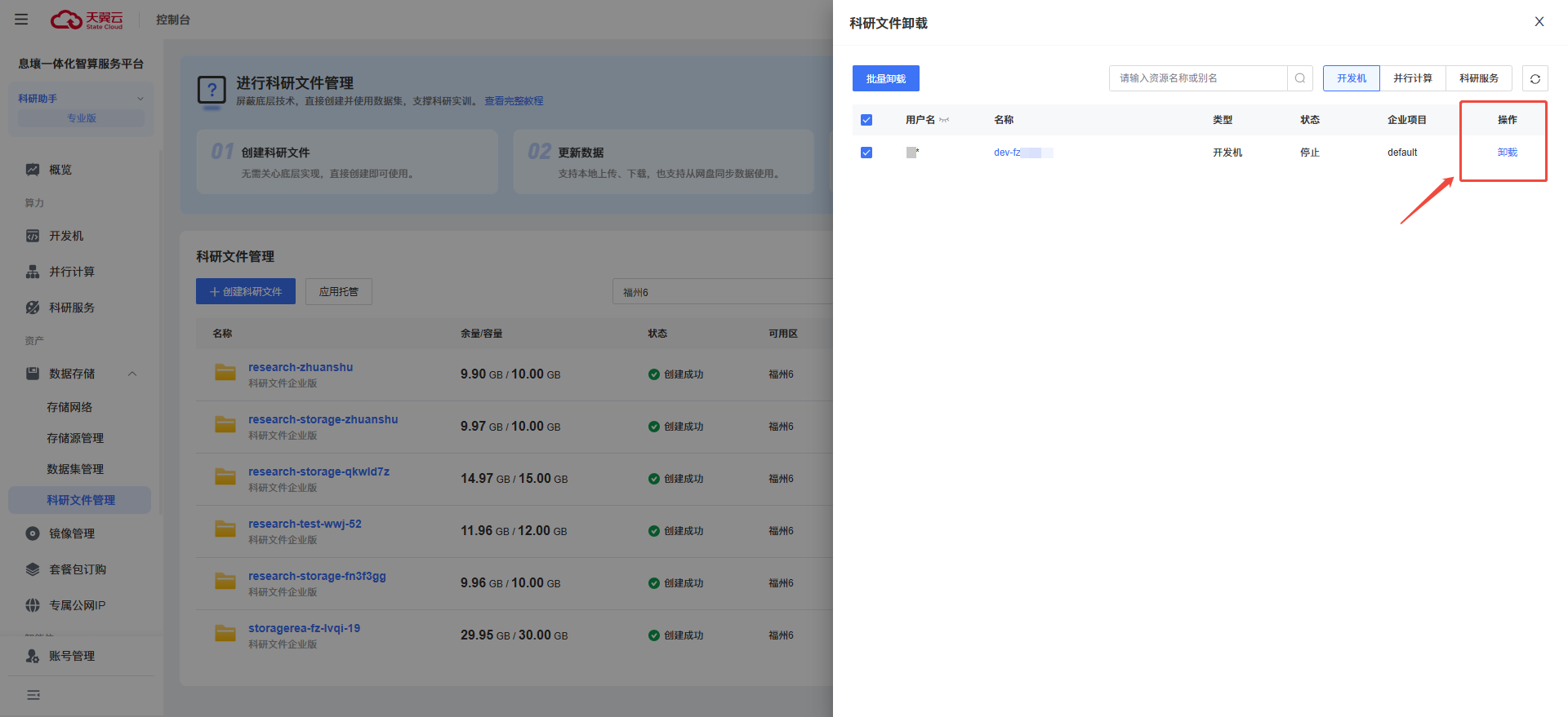 这里需要特别注意:如果科研文件有挂载到开发机资源,迁移前需要先卸载,否则将导致该开发机启动异常。