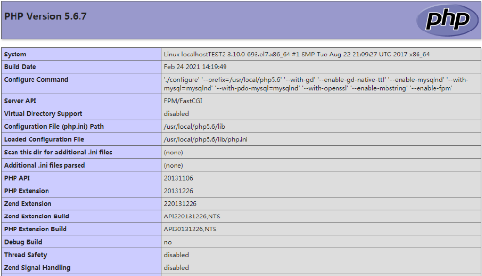 - 本地电脑打开浏览器输入访问地址:http://主机IP地址/info.php,显示如下页面则验证成功。