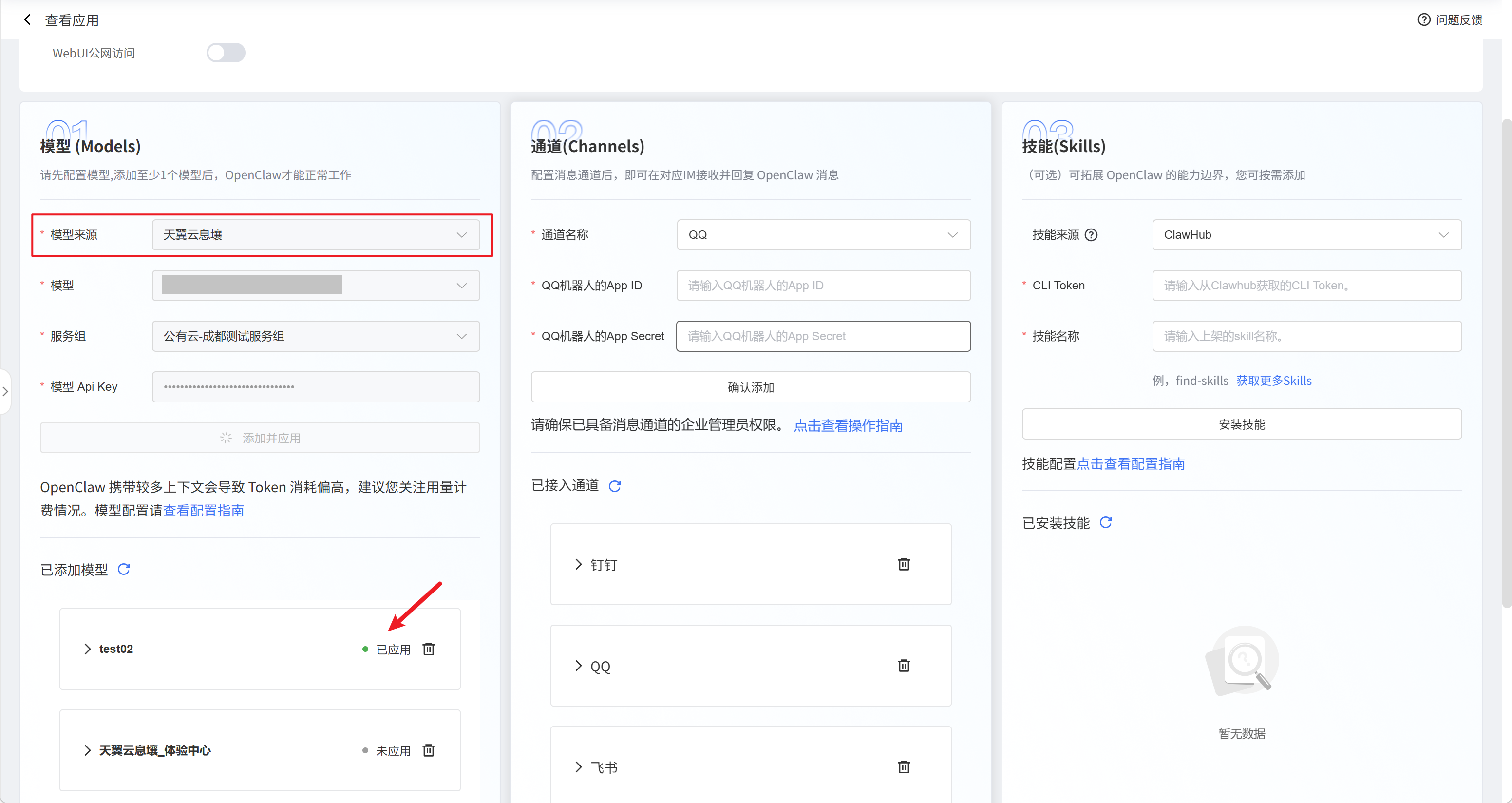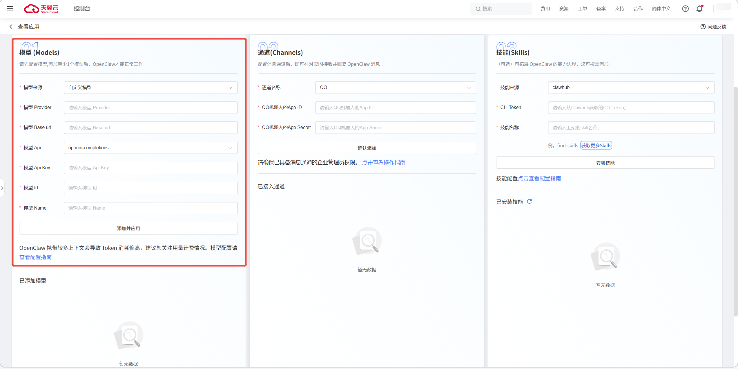 点击“应用配置”页签,进入OpenClaw应用配置页面。在“模型”模块中,您可以为OpenClaw配置所需模型。天翼云支持: