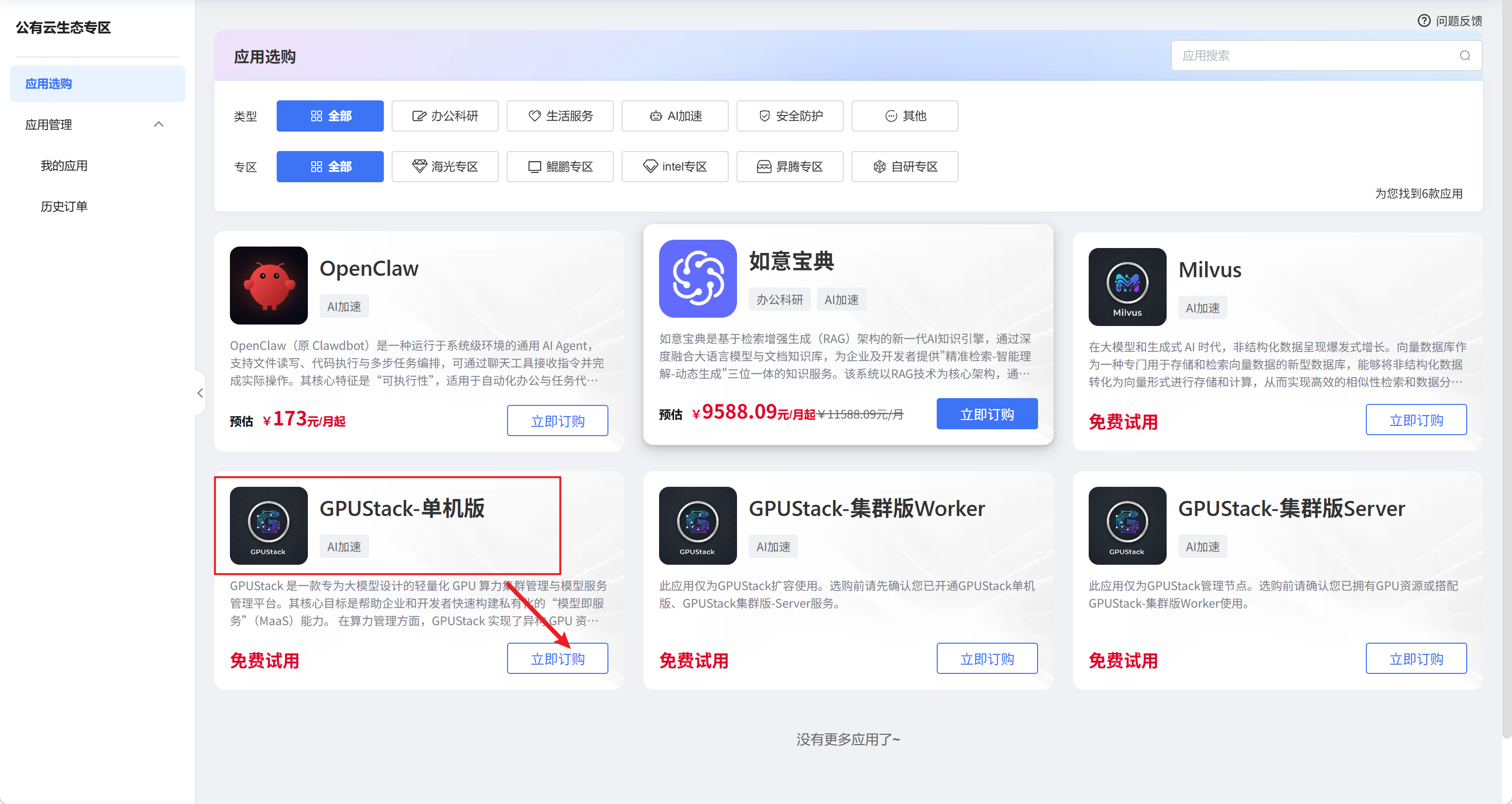 在应用选购列表中,找到“GPUStack-单机版”,点击“立即订购”。