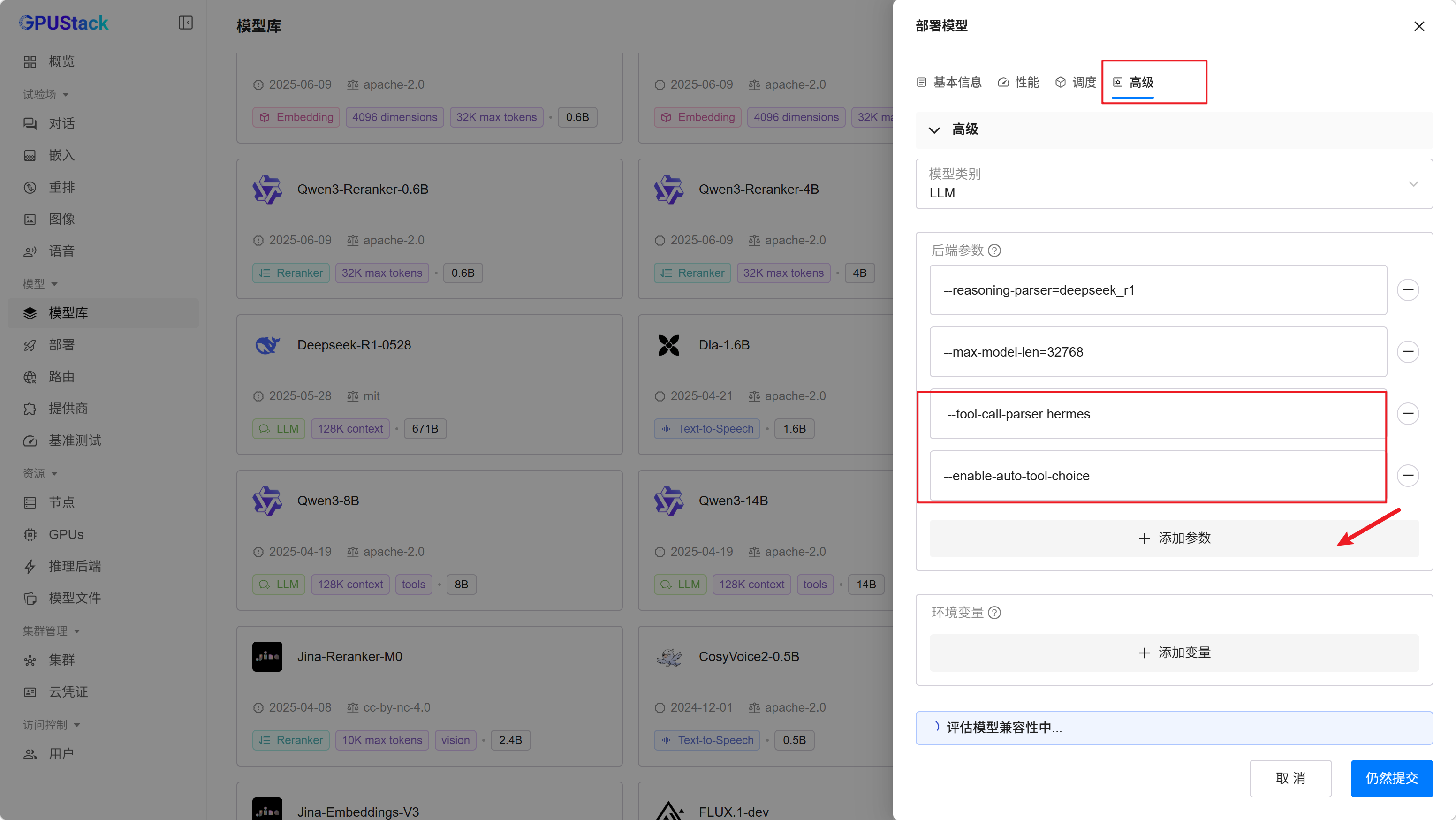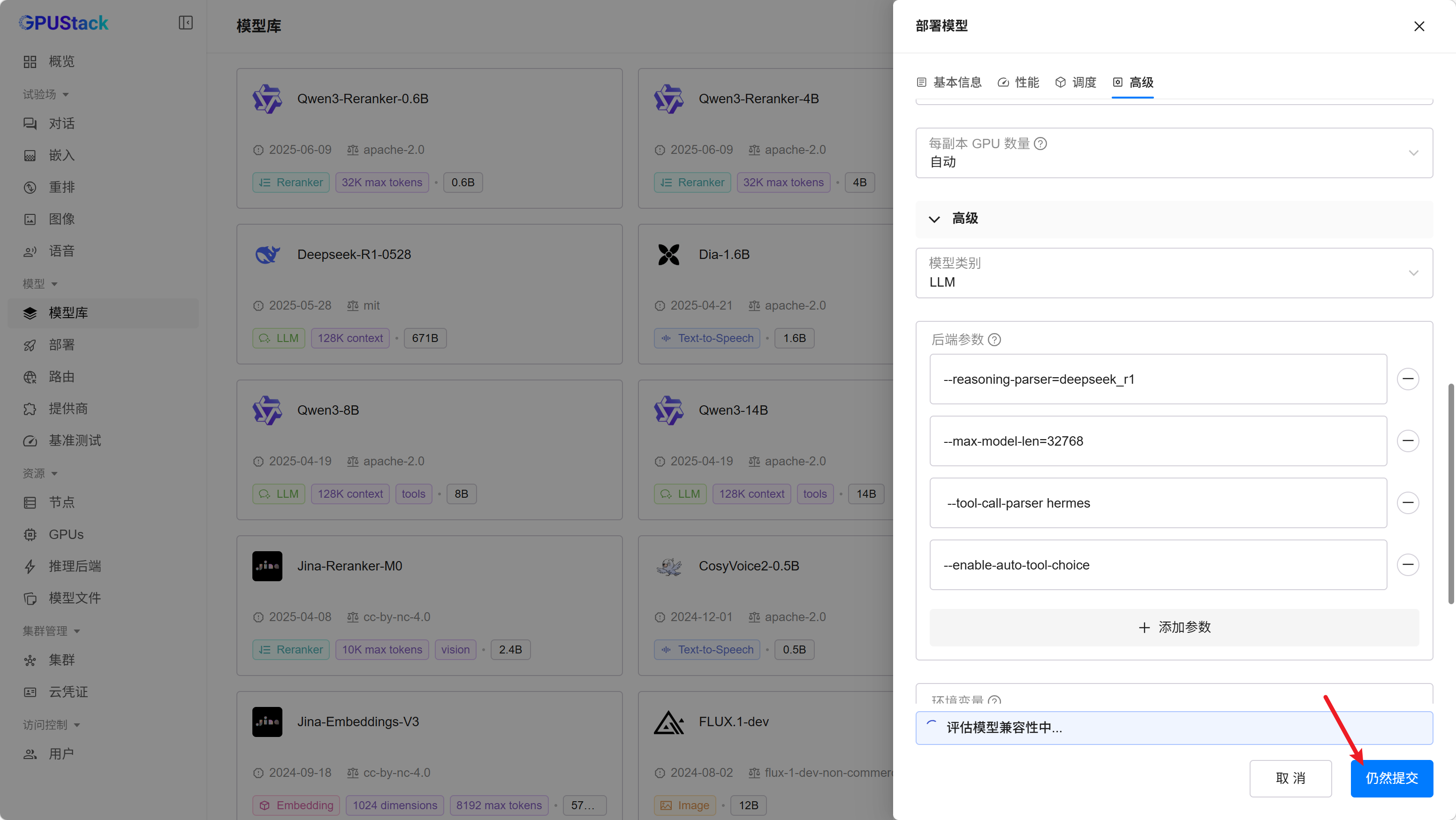 --tool-call-parser hermes --enable-auto-tool-choice4)参数配置完成后,点击“提交”按钮,开始部署模型。