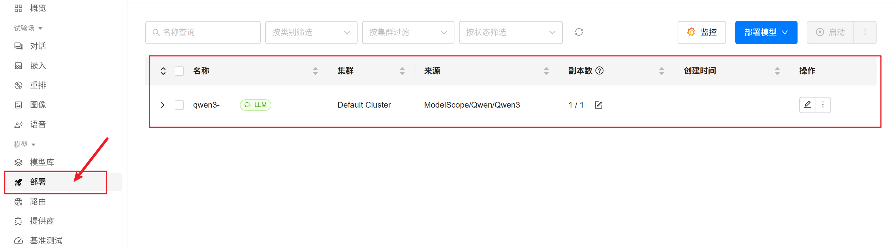 模型部署:支持主流开源大模型一键部署,兼容Hugging Face、ModelScope等模型源,集成vLLM、SGLang和TensorRT-LLM等高性能推理引擎,满足不同场景性能需求;