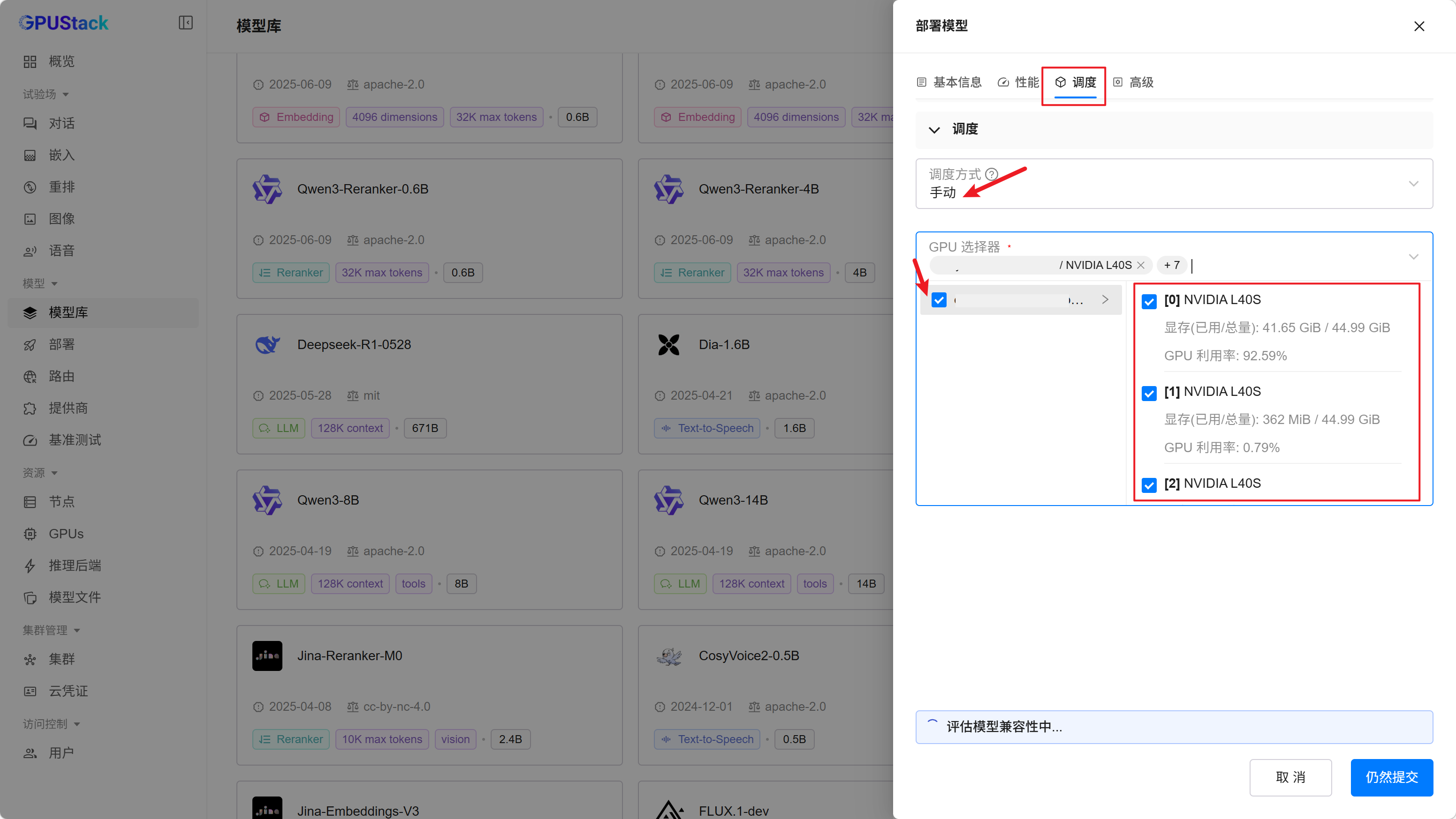 2)调度:点击“调度页签”GPU卡调度配置。调度方式推荐选择“手动”,GPU器选择推荐选择全部GPU卡,也可以根据您的实际调度情况进行分配。