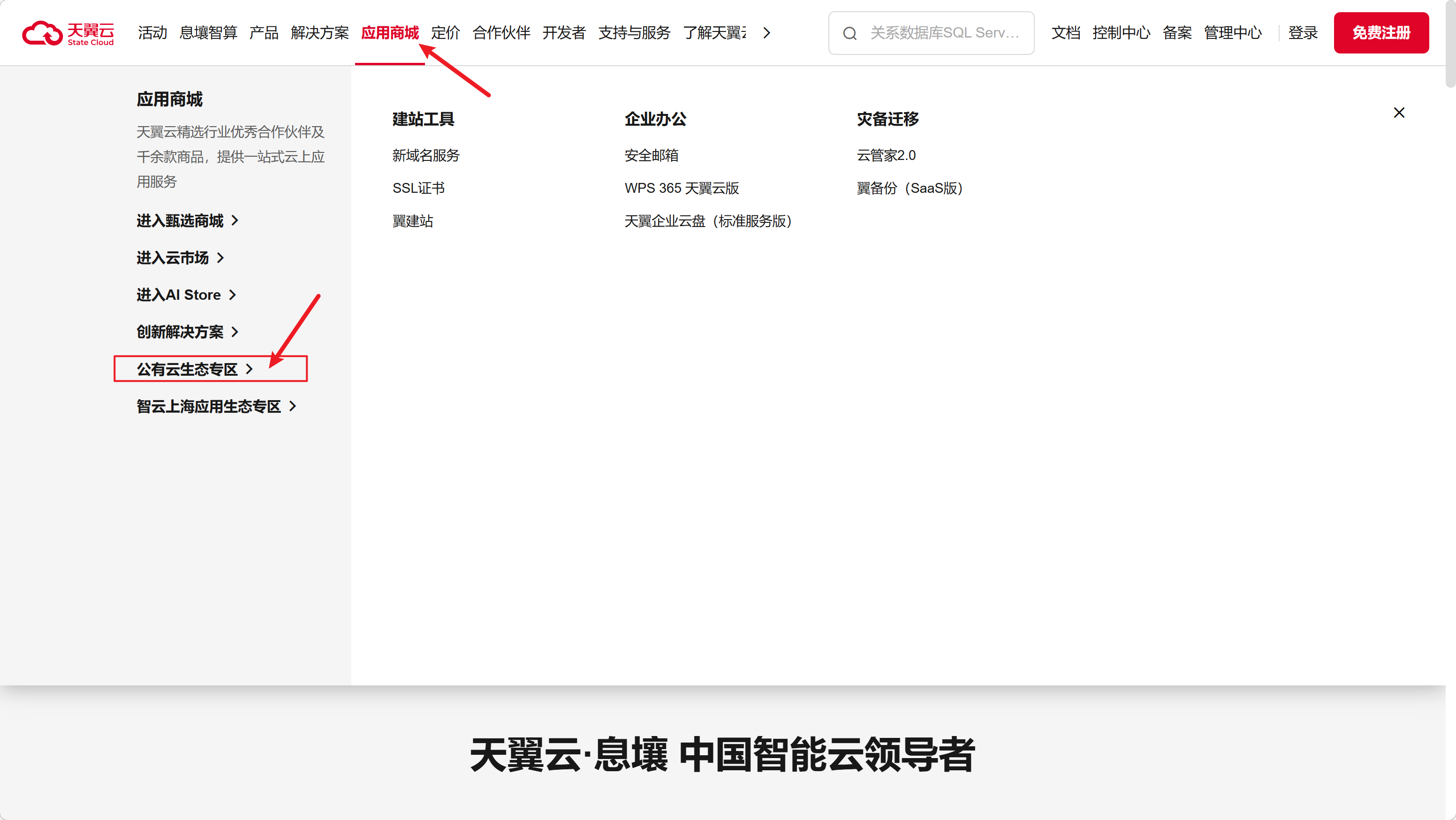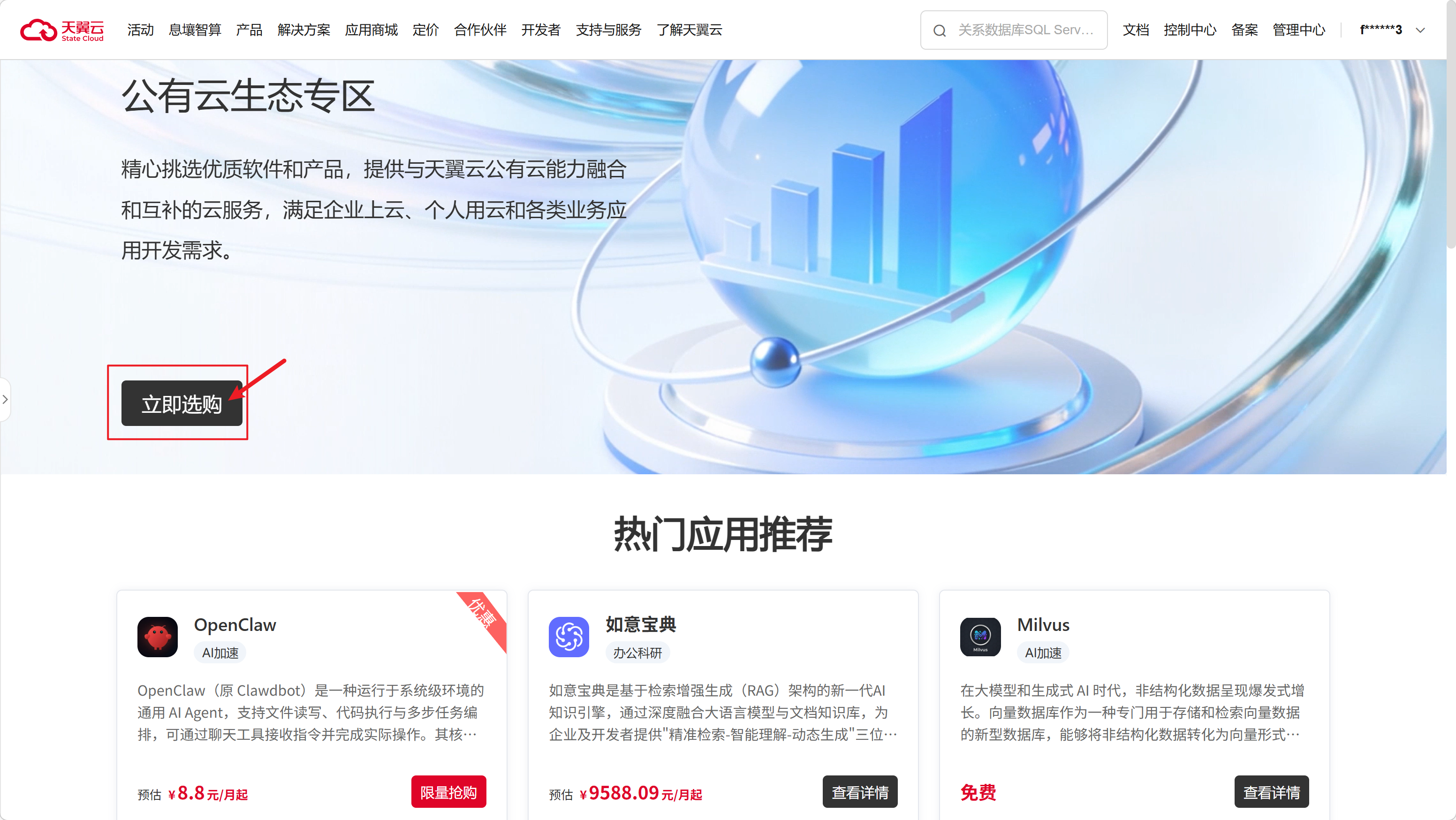 登录天翼云官网,选择应用商城 - 公有云生态专区,点击立即选购,进入应用专区页。